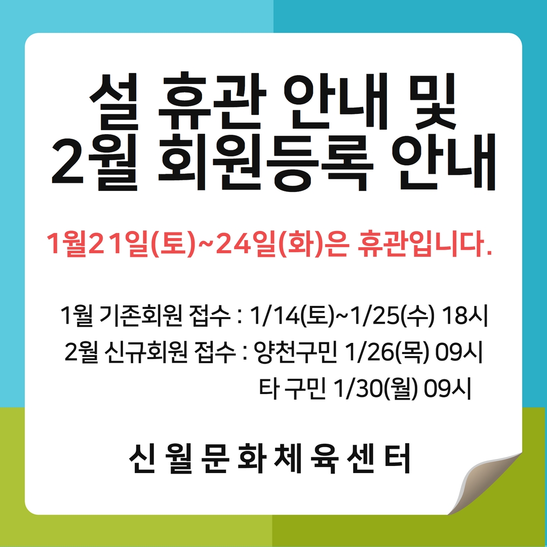 신월문화체육센터 신월문화체육센터 설 휴관 및 2월 회원등록 안내 작성자 관리자 등록일자 2023년 1월 12일 11시 12분 29초 조회 413 2월 등록안내.jpg [ Size : 252.12KB , Down : 267 ] 미리보기 다운로드 목록보기