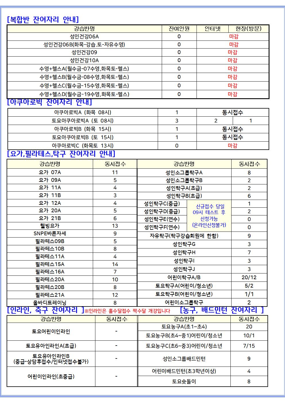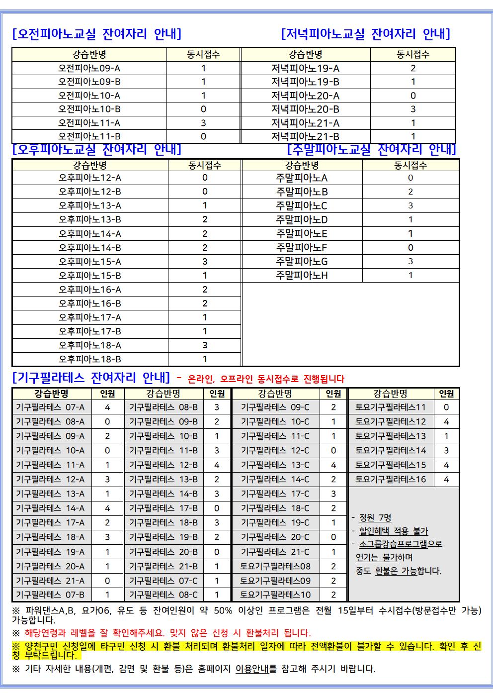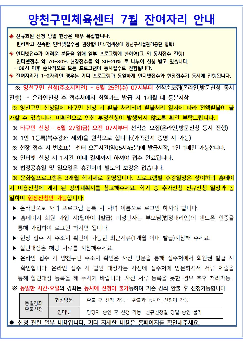 양천구민체육센터 양천구민체육센터 7월 프로그램 잔여자리 안내