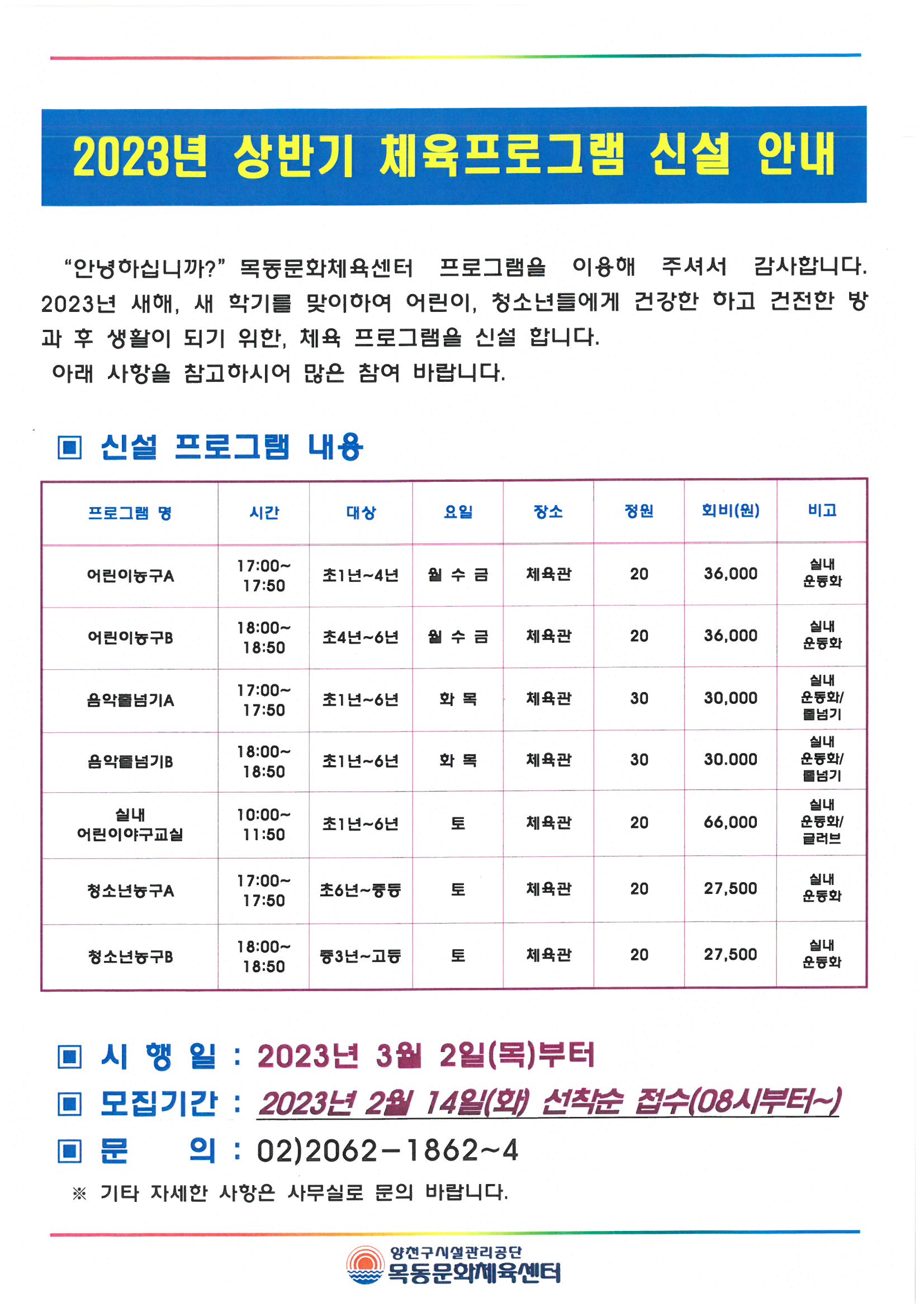 목동문화체육센터 목동문화체육센터 2023년도 상반기 체육관 프로그램(농구, 야구, 줄넘기) 신설 안내 작성자 관리자 등록일자 2023년 2월 6일 9시 21분 55초 조회 460 2023년 상반기 체육관 프로그램 신설 안내지(스캔).jpg [ Size : 379.51KB , Down : 361 ] 미리보기 다운로드 목록보기