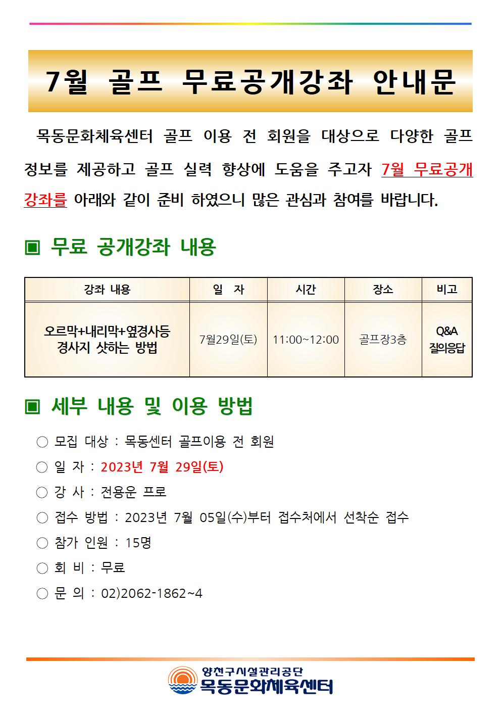 목동문화체육센터 목동문화체육센터 7월 골프 무료공개강좌 안내 작성자 임혜연 등록일자 2023년 7월 5일 10시 15분 20초 조회 508 목동센터 7월 골프 무료 공개강좌 안내문001.jpg [ Size : 145.8KB , Down : 142 ] 미리보기 다운로드 목록보기