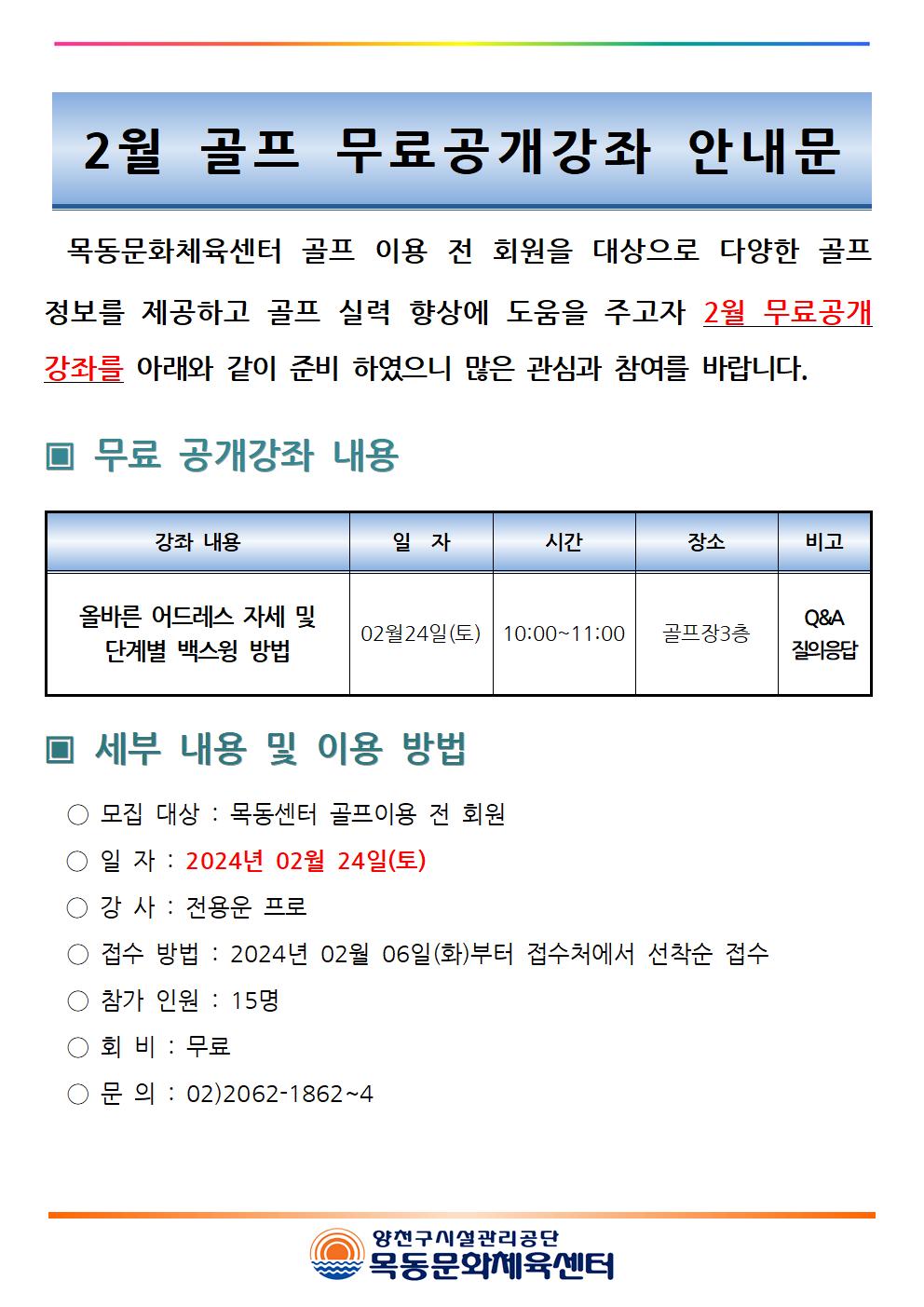 목동문화체육센터 목동문화체육센터 2월 골프 무료공개강좌 안내 작성자 임혜연 등록일자 2024년 2월 6일 11시 36분 34초 조회 402 목동센터 2월 골프 무료 공개강좌 안내문001.jpg [ Size : 146.86KB , Down : 143 ] 미리보기 다운로드 목록보기