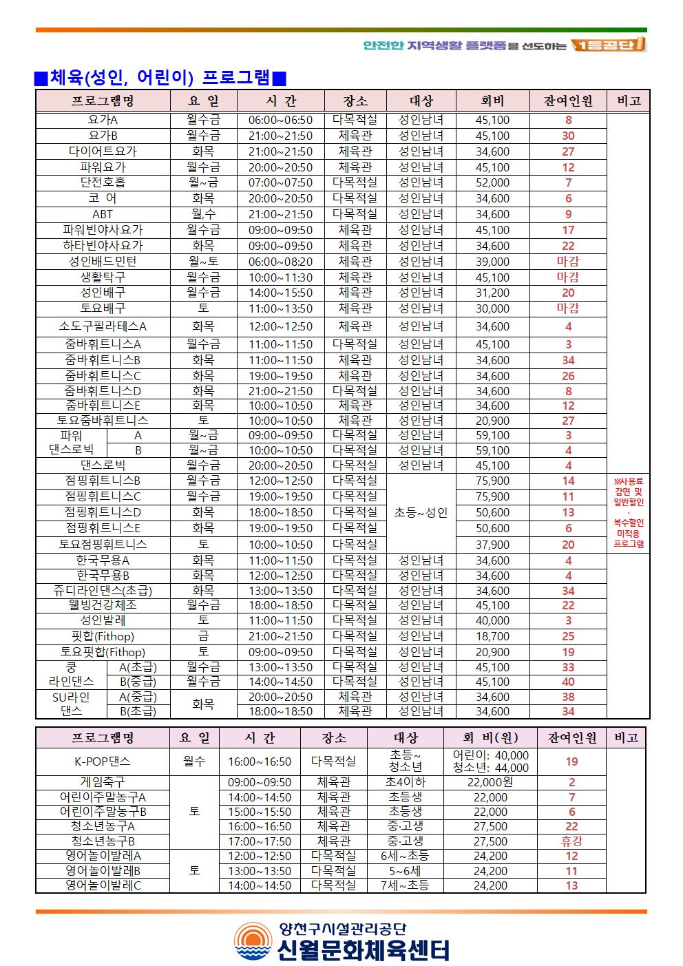 신월문화체육센터 신월문화체육센터 6월 마감프로그램 및 잔여인원 안내