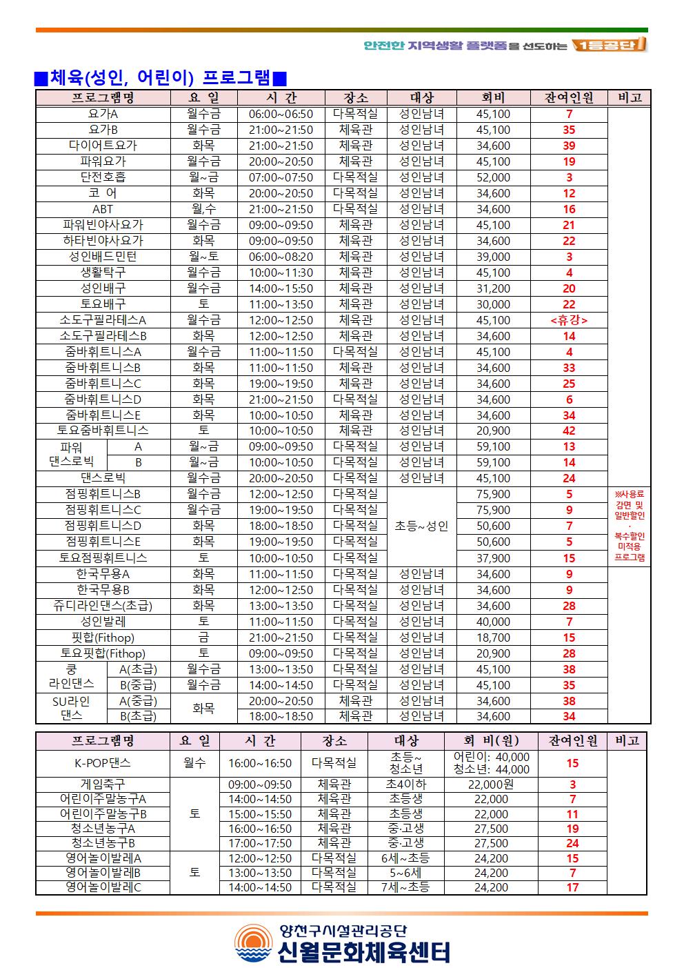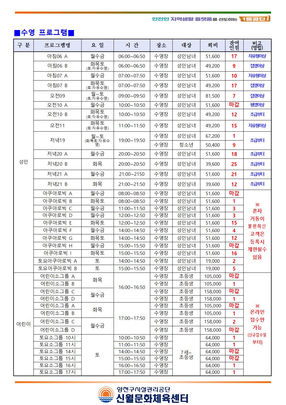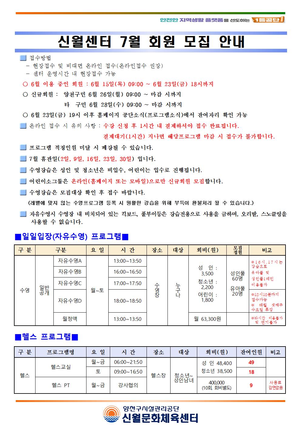 신월문화체육센터 신월문화체육센터 7월 마감프로그램 및 잔여인원 안내(헬스, 수영, 체육프로그램) 작성자 손미선 등록일자 2023년 6월 23일 18시 29분 16초 조회 729 신월센터 7월 회원 모집안내(2023.7001.jpg [ Size : 212.17KB , Down : 869 ] 미리보기 다운로드 신월센터 7월 회원 모집안내(2023.7002.jpg [ Size : 293.79KB , Down : 883 ] 미리보기 다운로드 신월센터 7월 회원 모집안내(2023.7003.jpg [ Size : 342.85KB , Down : 851 ] 미리보기 다운로드 목록보기