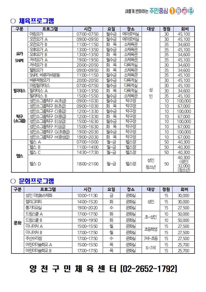 양천구민체육센터 양천구민체육센터 11월 프로그램 회원 모집 안내 작성자 등록일자 2020년 10월 26일 15시 33분 2초 조회 6,026 11월 운영 프로그램.gif [ Size : 69.11KB , Down : 126 ] 미리보기 다운로드 목록보기