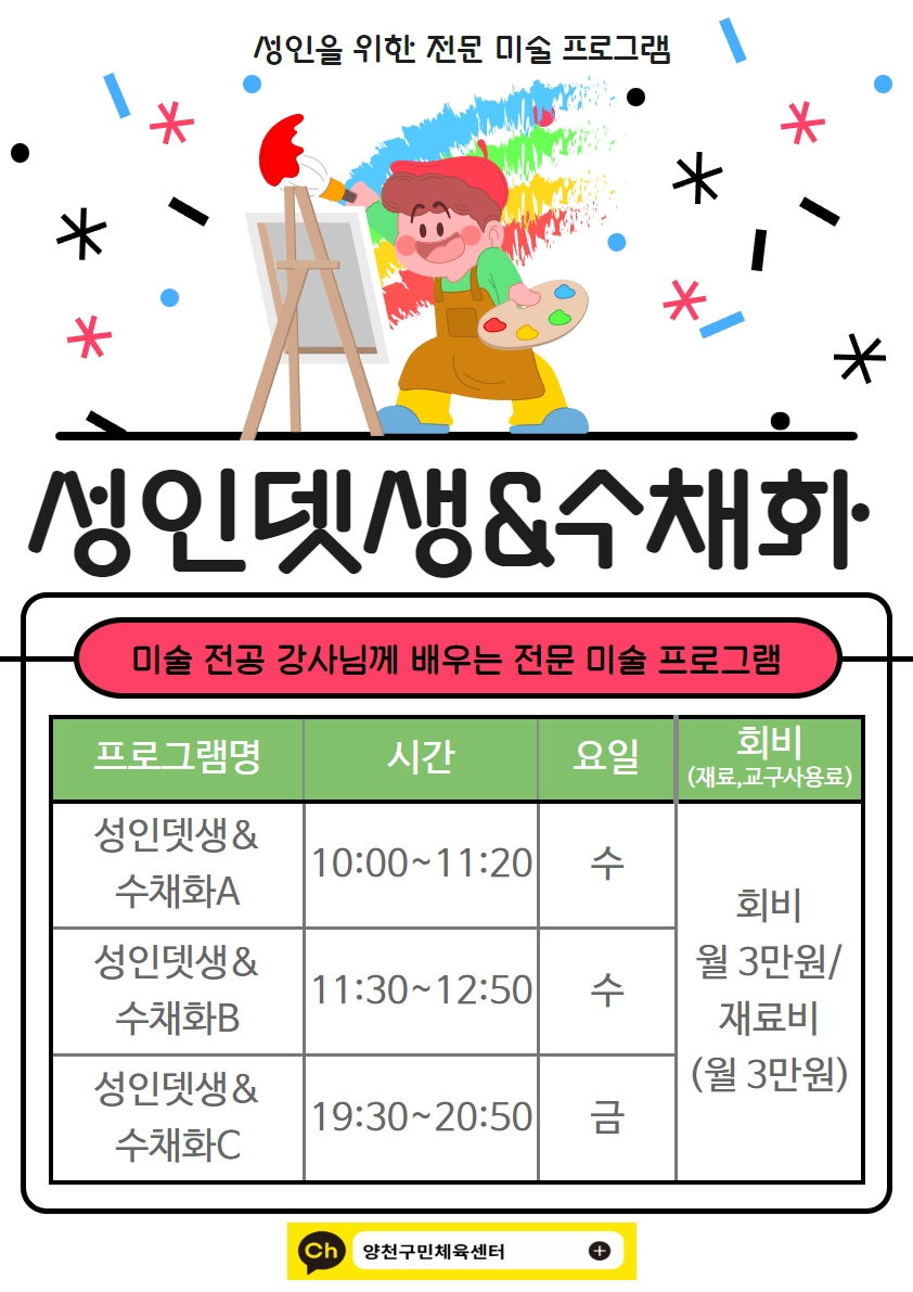 양천구민체육센터 성인뎃생&수채화 작성자 개발자 등록일자 2023년 6월 14일 9시 43분 50초 조회 346 성인을 위한 전문 미술 프로그램 성인뎃생&수채화 미술 전공 강사님께 배우는 전문 미술 프로그램 성인뎃생&수채화: 프로그램명, 시간,요일,회비(재료,교구사용료) 프로그램명 시간 요일 회비(재료,교구사용료) 성인뎃생&수채화A 10:00-11:20 수 회비월 3만원/재료비(월 3만원) 성인뎃생& 수채화B 11:30~12:50 수 성인뎃생 & 수채화C 19:30-20:50 금 댓생수채화_749A20230613174913.jpg [ Size : 323.42KB , Down : 274 ] 미리보기 다운로드 목록보기