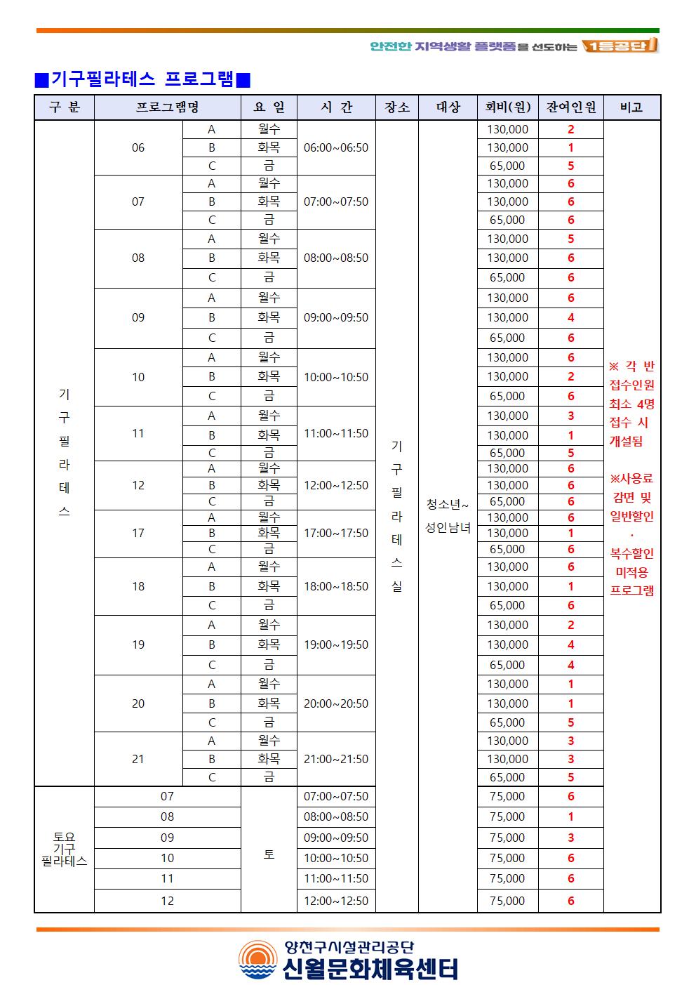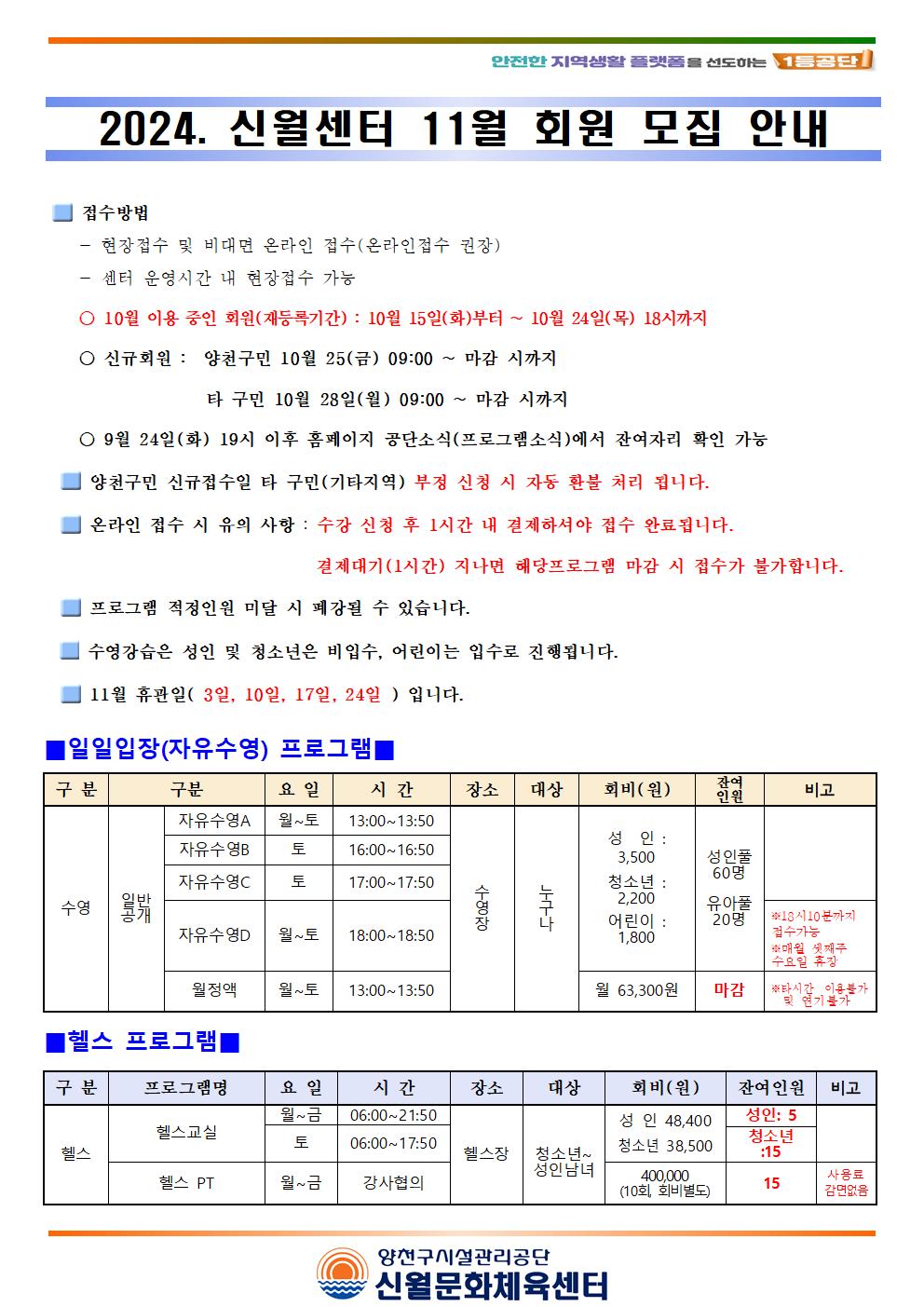신월문화체육센터 신월문화체육센터 11월 마감프로그램 및 잔여인원 안내 작성자 손미선 등록일자 2024년 10월 24일 18시 12분 18초 조회 738 신월센터 11월 회원 모집안내(2024.11001.jpg [ Size : 187.31KB , Down : 888 ] 미리보기 다운로드 신월센터 11월 회원 모집안내(2024.11002.jpg [ Size : 303.26KB , Down : 898 ] 미리보기 다운로드 신월센터 11월 회원 모집안내(2024.11003.jpg [ Size : 340.32KB , Down : 868 ] 미리보기 다운로드 신월센터 11월 회원 모집안내(2024.11004.jpg [ Size : 189.44KB , Down : 848 ] 미리보기 다운로드 목록보기