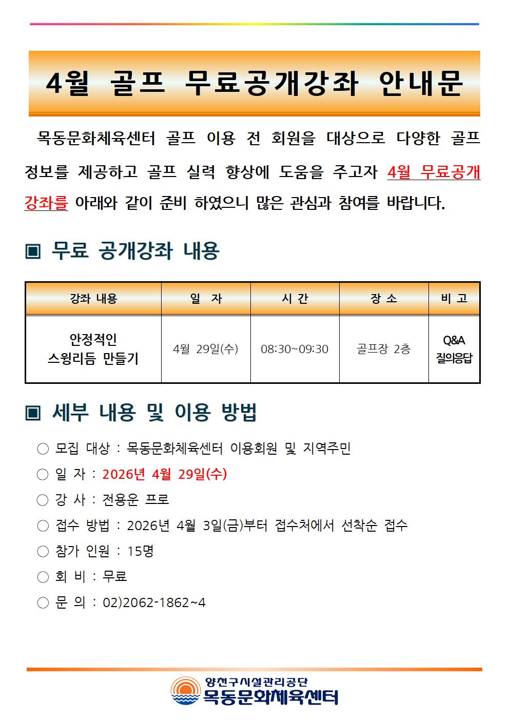 목동문화체육센터 목동문화체육센터 4월 골프무료공개강좌 안내 작성자 임혜연 등록일자 2026년 4월 2일 8시 47분 23초 조회 20 4월 골프 무료 공개강좌 안내문(2026년)001.jpg [ Size : 148.84KB , Down : 4 ] 미리보기 다운로드 목록보기