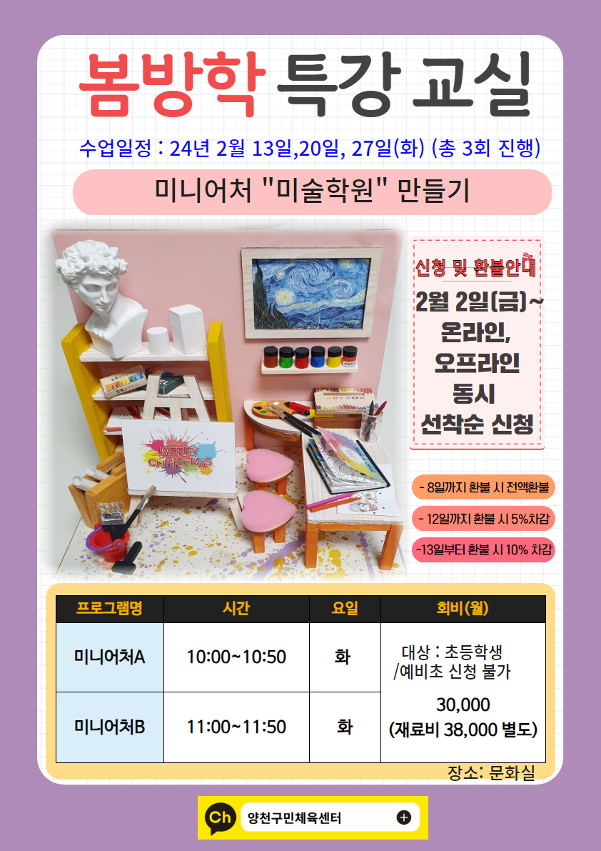 양천구민체육센터 양천구민체육센터 봄방학특강 미니어처 교실 운영안내 작성자 임명희 등록일자 2024년 1월 19일 13시 14분 31초 조회 587 봄방학미니어처 .jpg [ Size : 736.37KB , Down : 479 ] 미리보기 다운로드 목록보기