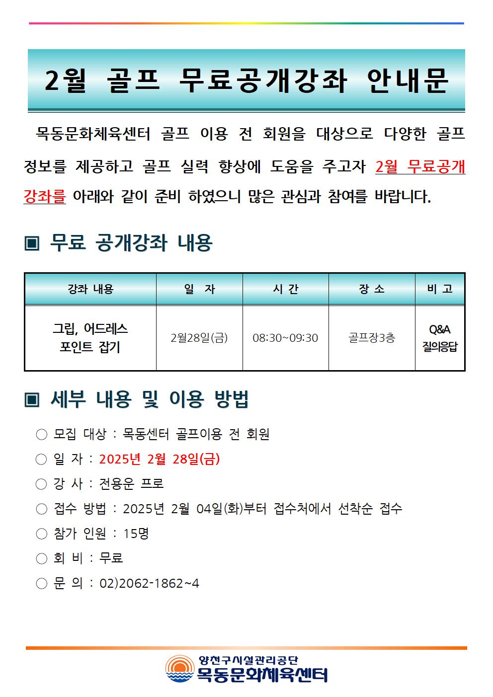 목동문화체육센터 목동문화체육센터 2월 골프 무료공개강좌 안내 작성자 임혜연 등록일자 2025년 2월 4일 10시 18분 55초 조회 291 2월 골프 무료 공개강좌 안내문 (2)001.jpg [ Size : 146.95KB , Down : 85 ] 미리보기 다운로드 목록보기