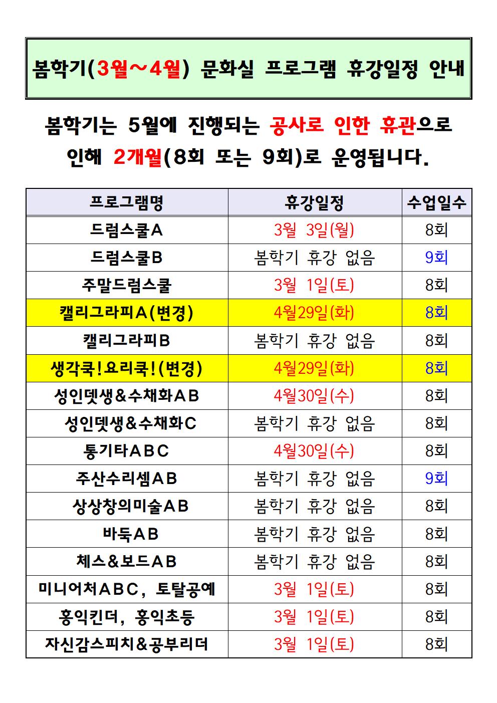 양천구민체육센터 양천구민체육센터 봄학기 문화실 프로그램 휴강일 안내(변경) 작성자 임명희 등록일자 2025년 3월 5일 8시 30분 47초 조회 353 봄학기 휴강일정001.jpg [ Size : 212.57KB , Down : 76 ] 미리보기 다운로드 목록보기