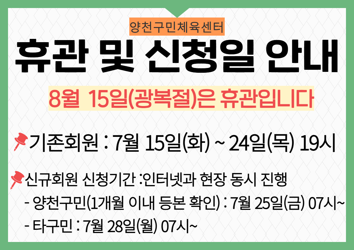 양천구민체육센터 양천구민체육센터 8월 프로그램 일정 안내 작성자 임명희 등록일자 2025년 7월 14일 9시 49분 55초 조회 1,133 8월 신청일정 .jpg [ Size : 457.03KB , Down : 2,195 ] 미리보기 다운로드 목록보기