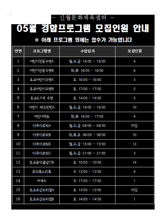 신월문화체육센터 신월문화체육센터 5월 경합프로그램 모집 안내 작성자 등록일자 2016년 4월 24일 14시 33분 23초 조회 1,311 noname01.jpg [ Size : 70.32KB , Down : 109 ] 미리보기 다운로드 목록보기