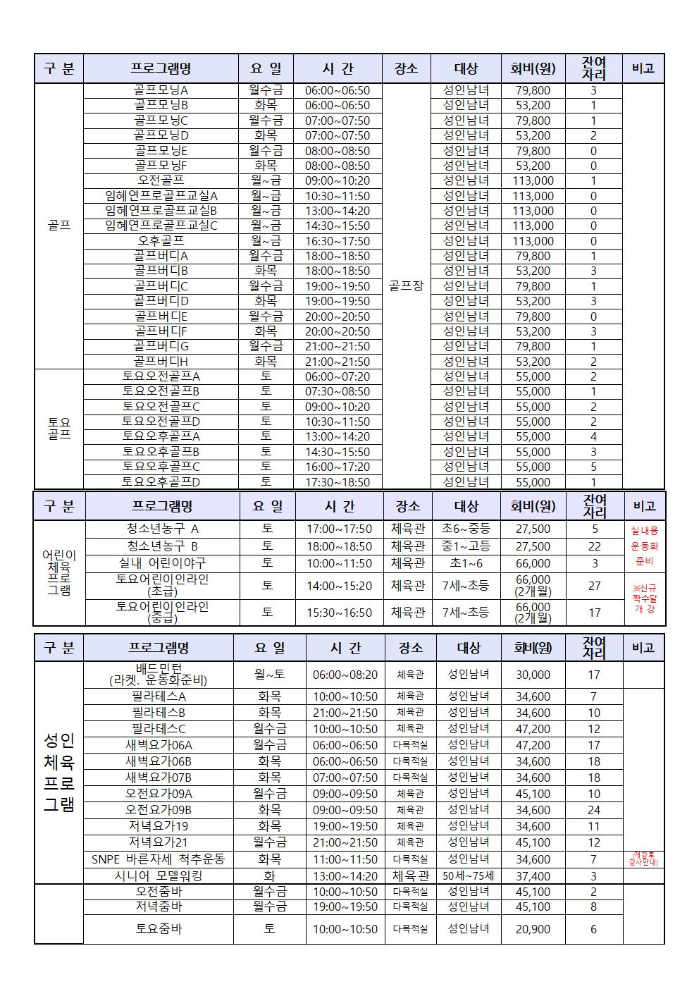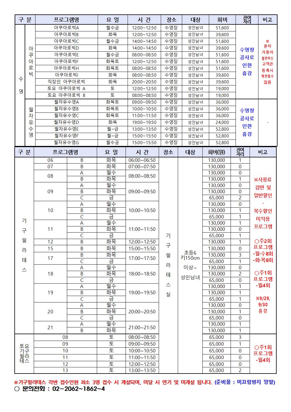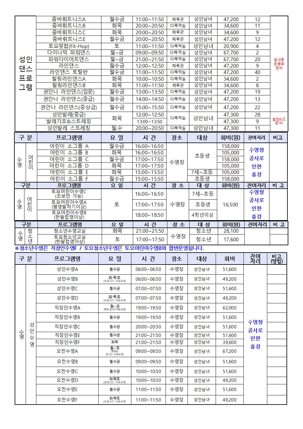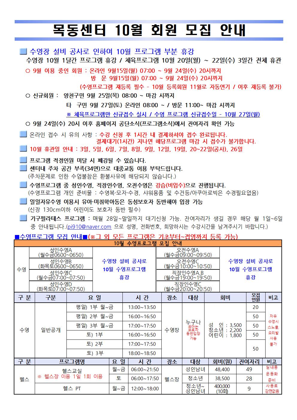 목동문화체육센터 목동문화체육센터 10월 프로그램 잔여자리 안내 작성자 문모다 등록일자 2025년 9월 24일 20시 14분 32초 조회 668 목동센터 10월 회원 모집 안내지-잔여자리001.jpg [ Size : 278.34KB , Down : 890 ] 미리보기 다운로드 목동센터 10월 회원 모집 안내지-잔여자리002.jpg [ Size : 318.51KB , Down : 894 ] 미리보기 다운로드 목동센터 10월 회원 모집 안내지-잔여자리003.jpg [ Size : 312.54KB , Down : 863 ] 미리보기 다운로드 목동센터 10월 회원 모집 안내지-잔여자리004.jpg [ Size : 277.74KB , Down : 865 ] 미리보기 다운로드 목록보기