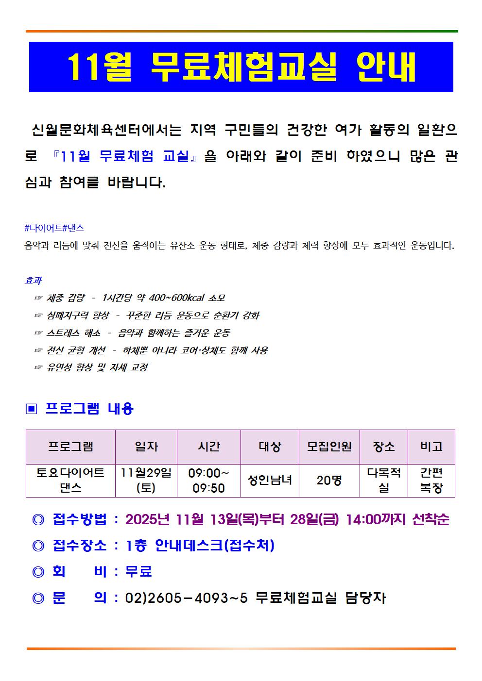 신월문화체육센터 신월문화체육센터 11월 무료체험교실 안내 작성자 신영범 등록일자 2025년 11월 13일 9시 52분 55초 조회 26 11월 무료체험교실 안내문(토요다이어트댄스)001.jpg [ Size : 156.99KB , Down : 26 ] 미리보기 다운로드 목록보기