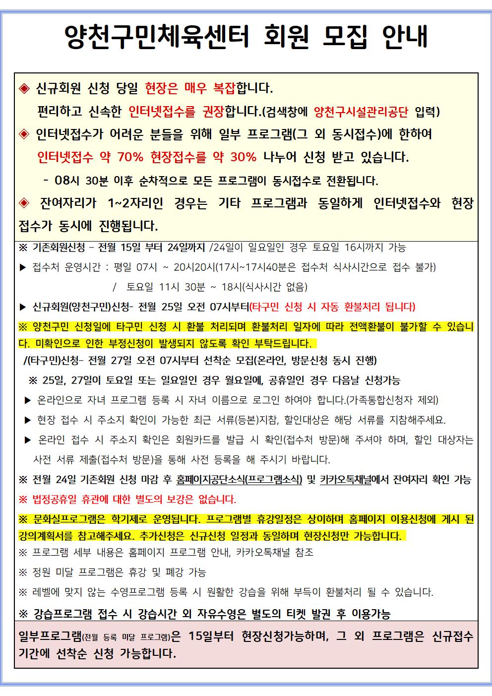 양천구민체육센터 양천구민체육센터 신규 신청 및 프로그램 안내 작성자 임명희 등록일자 2023년 9월 19일 9시 50분 1초 조회 3,690 24년 회원모집안내(4월 운영기준)001.jpg [ Size : 281.36KB , Down : 1,754 ] 미리보기 다운로드 목록보기