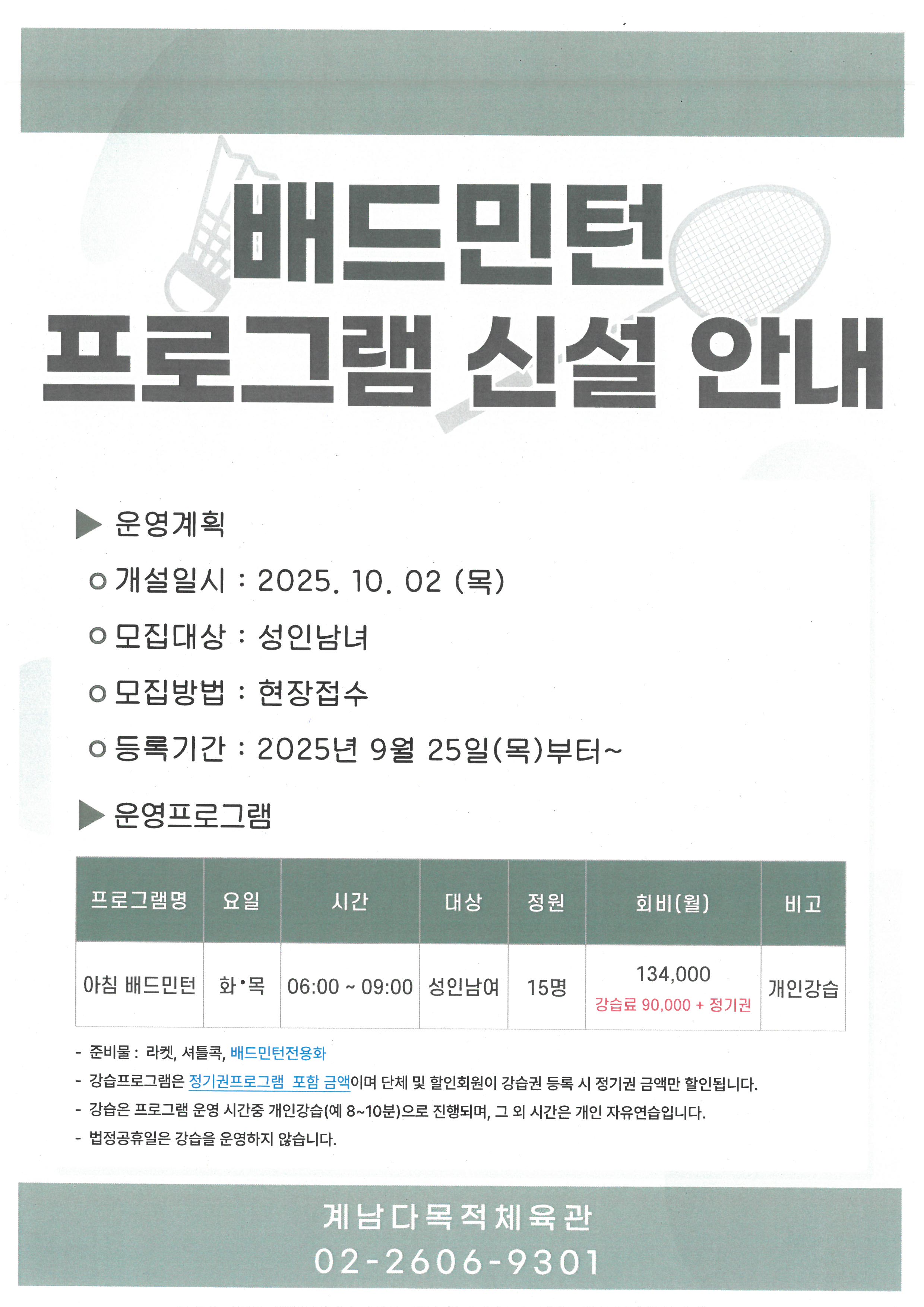계남다목적체육관 계남다목적체육관 배드민턴 프로그램 신설 운영 안내 작성자 곽재신 등록일자 2025년 9월 4일 15시 7분 37초 조회 186 배드민턴프로그램 신설.jpg [ Size : 586.91KB , Down : 51 ] 미리보기 다운로드 목록보기