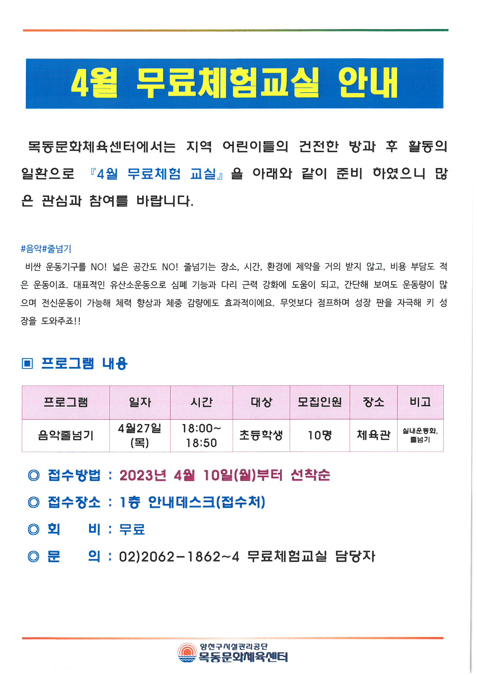 목동문화체육센터 목동문화체육센터 4월 무료체험교실 운영 안내 작성자 관리자 등록일자 2023년 4월 6일 14시 19분 43초 조회 460 4월 무료체험 교실 안내문(줄넘기) 스캔.jpg [ Size : 322.56KB , Down : 264 ] 미리보기 다운로드 목록보기