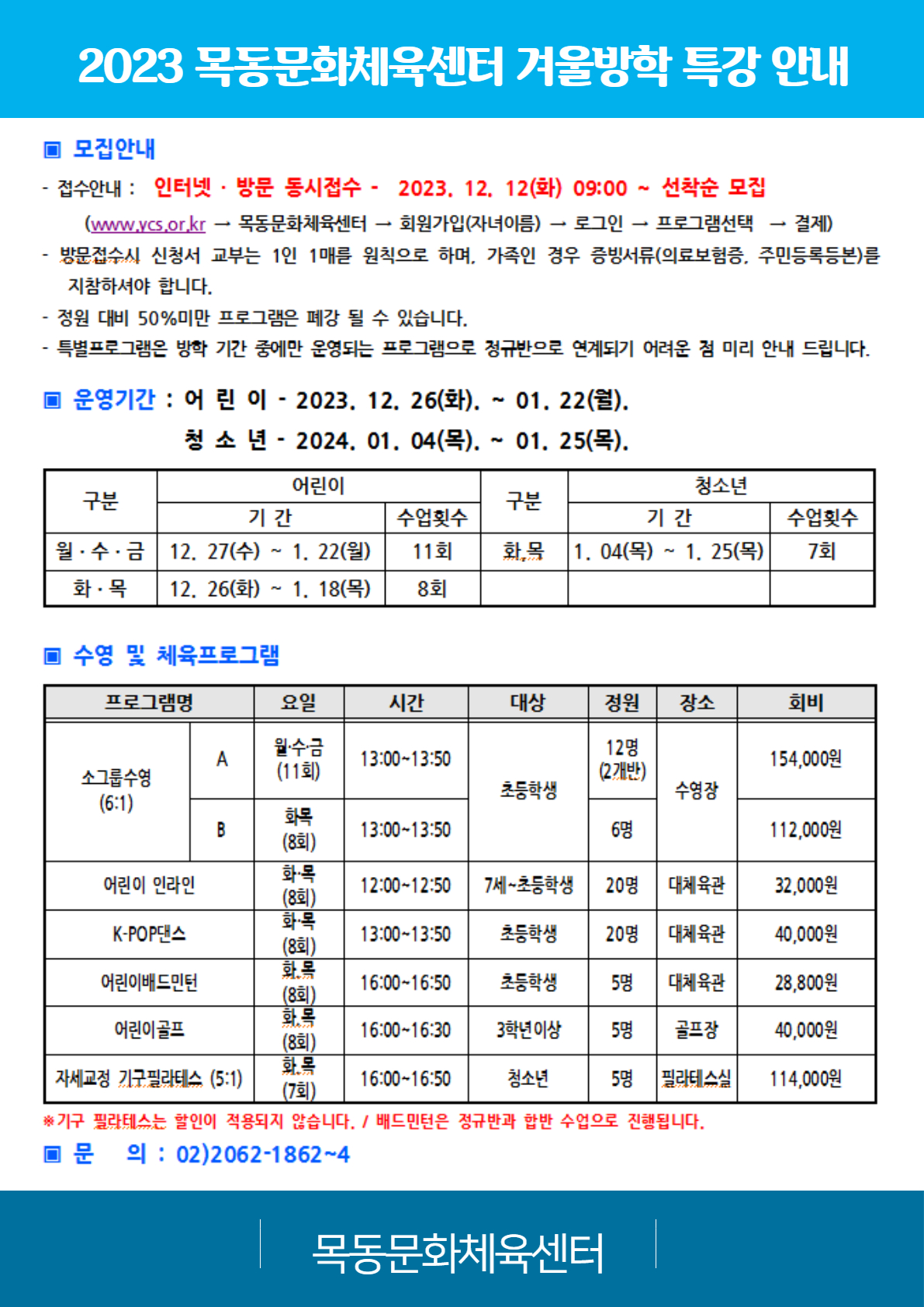 목동문화체육센터 목동문화체육센터 겨울방학특별프로그램 운영 안내 작성자 강주연 등록일자 2023년 11월 23일 13시 58분 14초 조회 466 목동문화체육센터 겨울방학특강 안내지.jpg [ Size : 1002.97KB , Down : 405 ] 미리보기 다운로드 목록보기