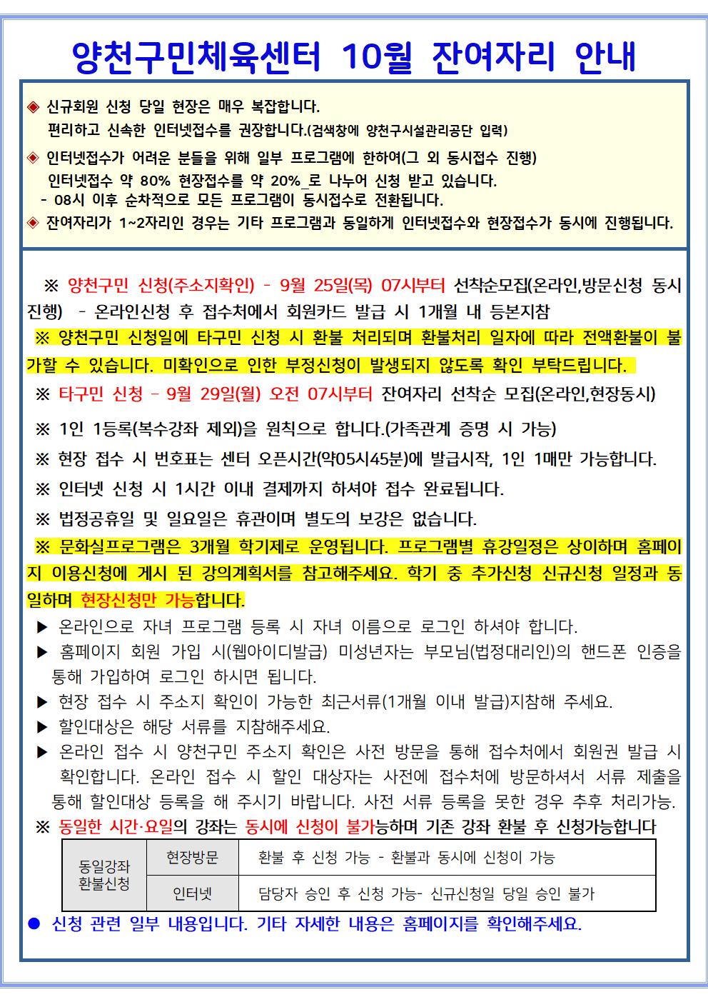 양천구민체육센터 양천구민체육센터 10월 프로그램 잔여자리 안내