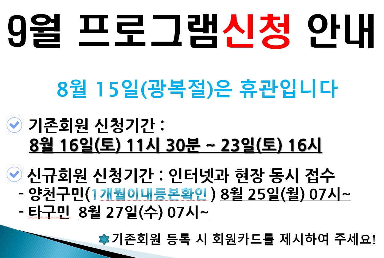 양천구민체육센터 양천구민체육센터 휴관 및 접수 일정 안내 작성자 임명희 등록일자 2025년 8월 13일 18시 42분 25초 조회 695 9월 휴관안내 및 접수안내.jpg [ Size : 349.8KB , Down : 1,016 ] 미리보기 다운로드 목록보기