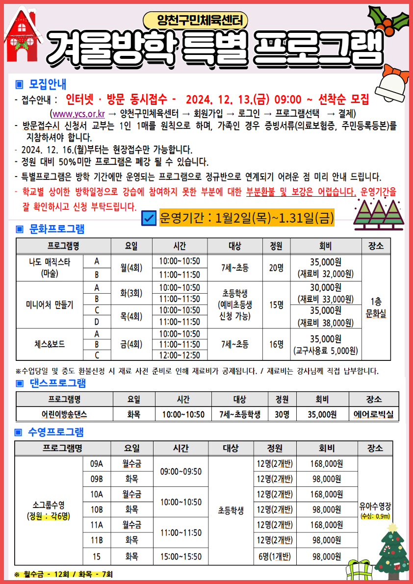양천구민체육센터 양천구민체육센터 겨울방학 특별프로그램 운영안내 작성자 임명희 등록일자 2024년 11월 25일 15시 46분 19초 조회 5,070 겨울방학특강(최종).jpg [ Size : 871.54KB , Down : 5,890 ] 미리보기 다운로드 목록보기