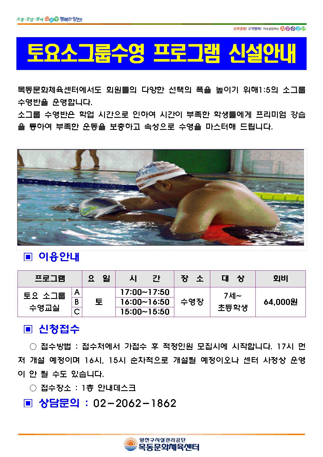 목동문화체육센터 목동문화체육센터 토요소그룹수영 신설안내 작성자 등록일자 2018년 9월 11일 16시 48분 19초 조회 1,070 토요소그룹수영001.jpg [ Size : 275.63KB , Down : 115 ] 미리보기 다운로드 목록보기