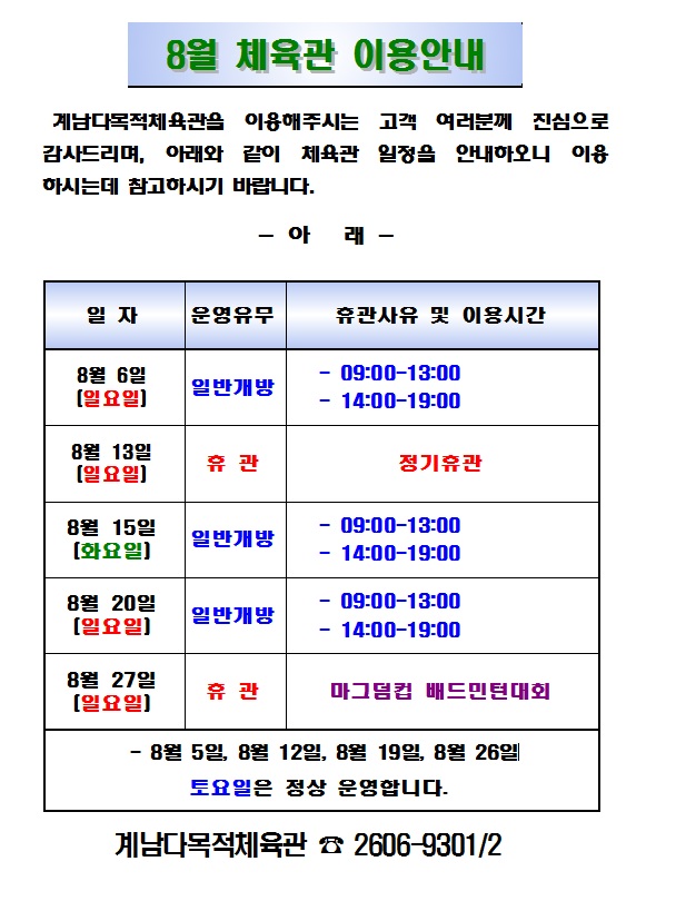 계남다목적체육관 계남다목적체육관 8월 이용안내 작성자 등록일자 2017년 7월 26일 9시 18분 25초 조회 1,343 계남다목적체육관 8월 이용안내를 붙임과 같이 첨부하오니 참고하시기 바랍니다. 8월 이용안내.jpg [ Size : 142.08KB , Down : 118 ] 미리보기 다운로드 목록보기