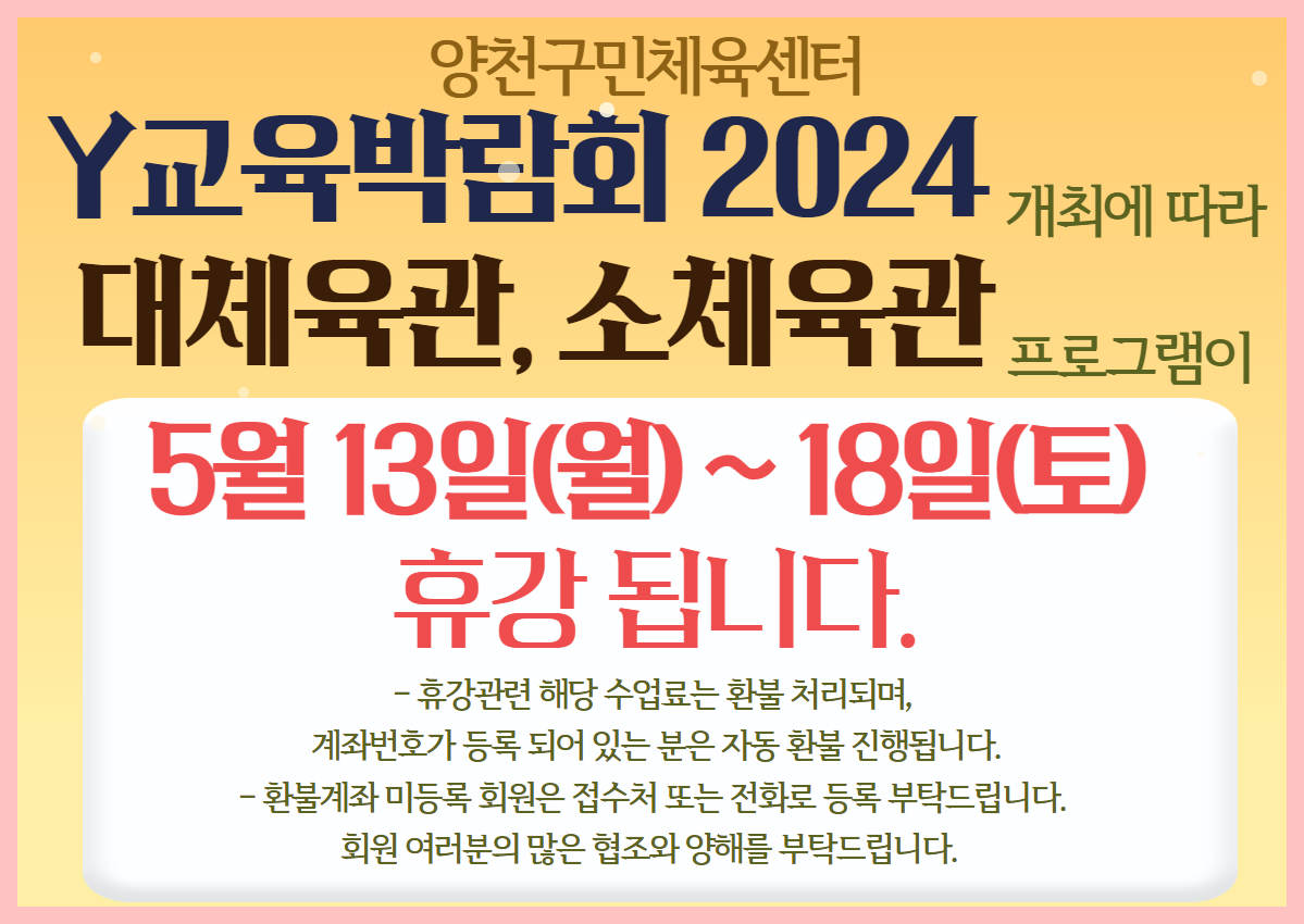 양천구민체육센터 'Y교육박람회' 개최에 따른 대체육과,소체육관 휴강 안내 작성자 임명희 등록일자 2024년 4월 11일 16시 49분 13초 조회 2,356 교육박람회휴강.jpg [ Size : 592.33KB , Down : 2,413 ] 미리보기 다운로드 목록보기