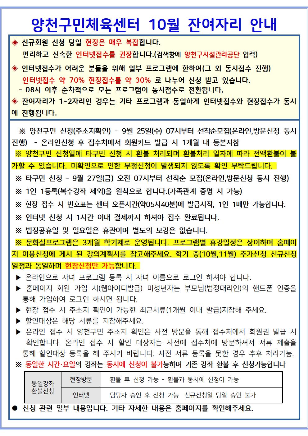 양천구민체육센터 양천구민체육센터 10월 프로그램 잔여자리 안내