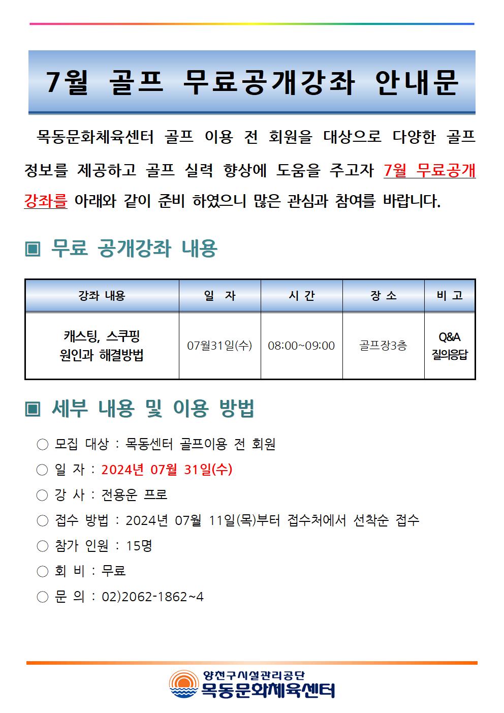 목동문화체육센터 목동문화체육센터 7월 골프 무료공개강좌 안내 작성자 임혜연 등록일자 2024년 7월 11일 9시 49분 32초 조회 494 목동센터 7월 골프 무료 공개강좌 안내문001.jpg [ Size : 144.97KB , Down : 125 ] 미리보기 다운로드 목록보기