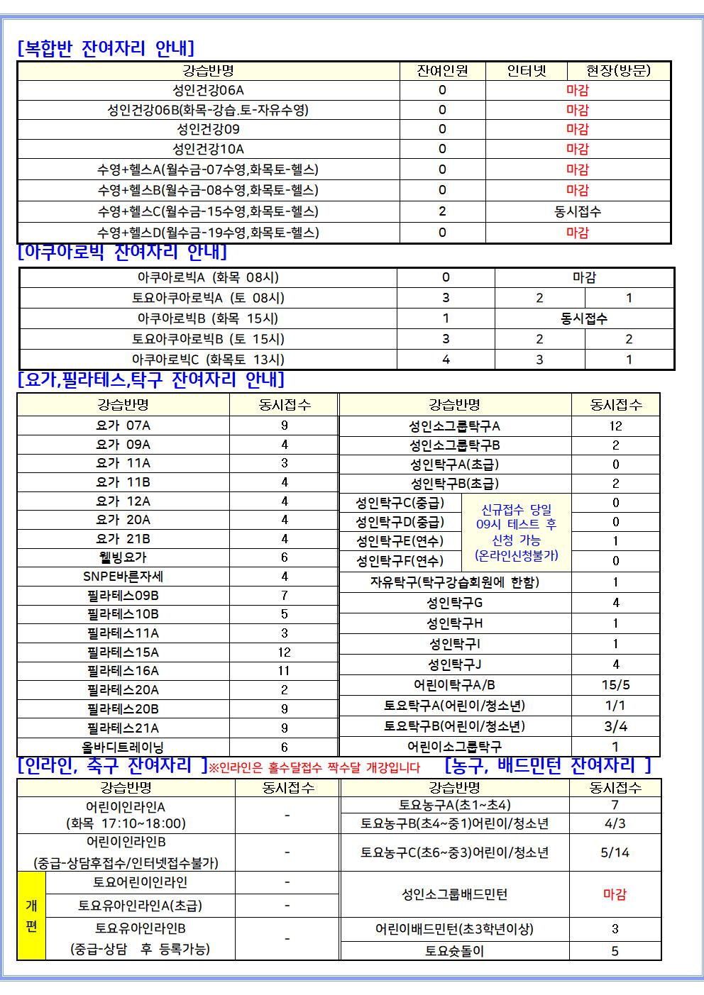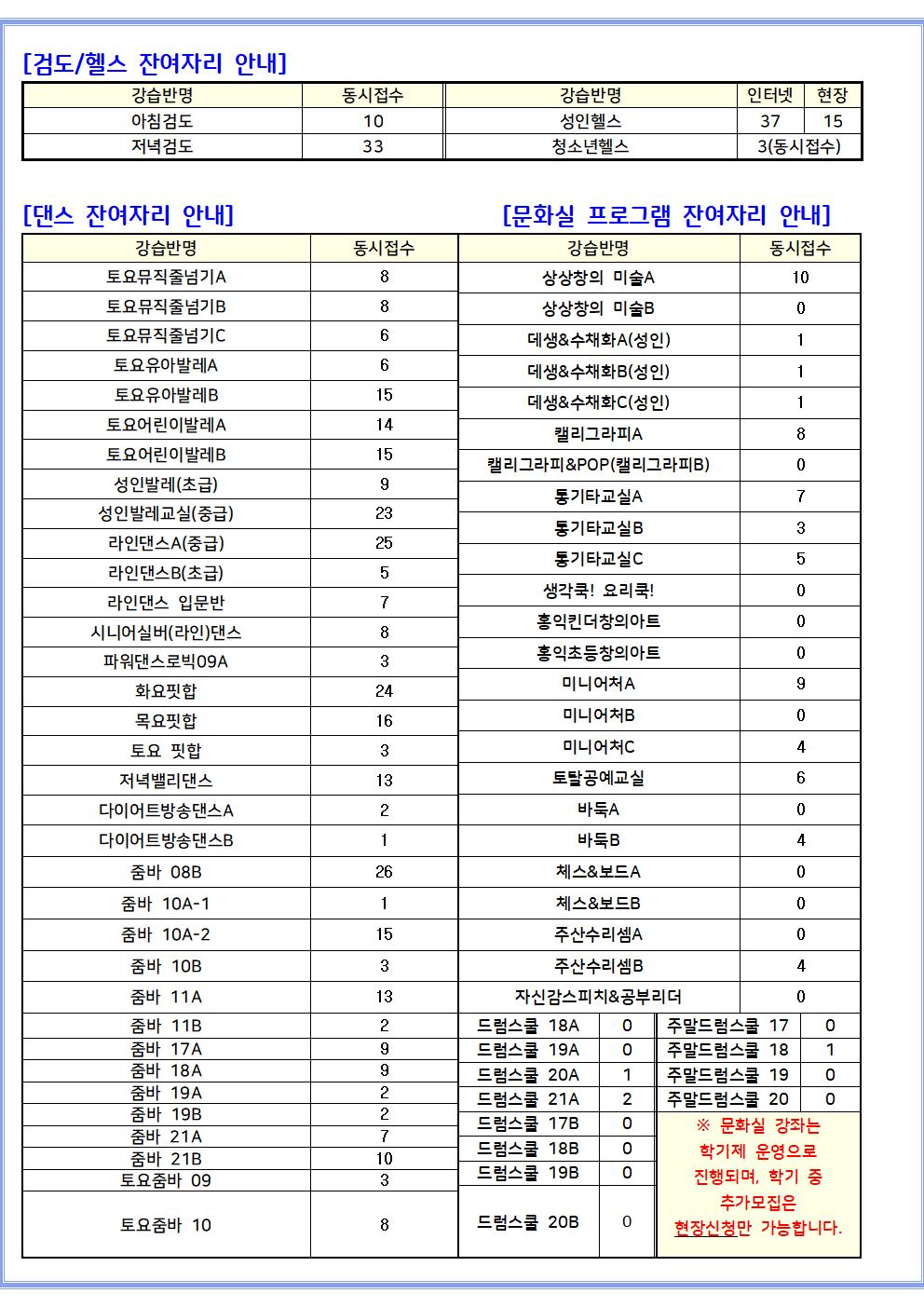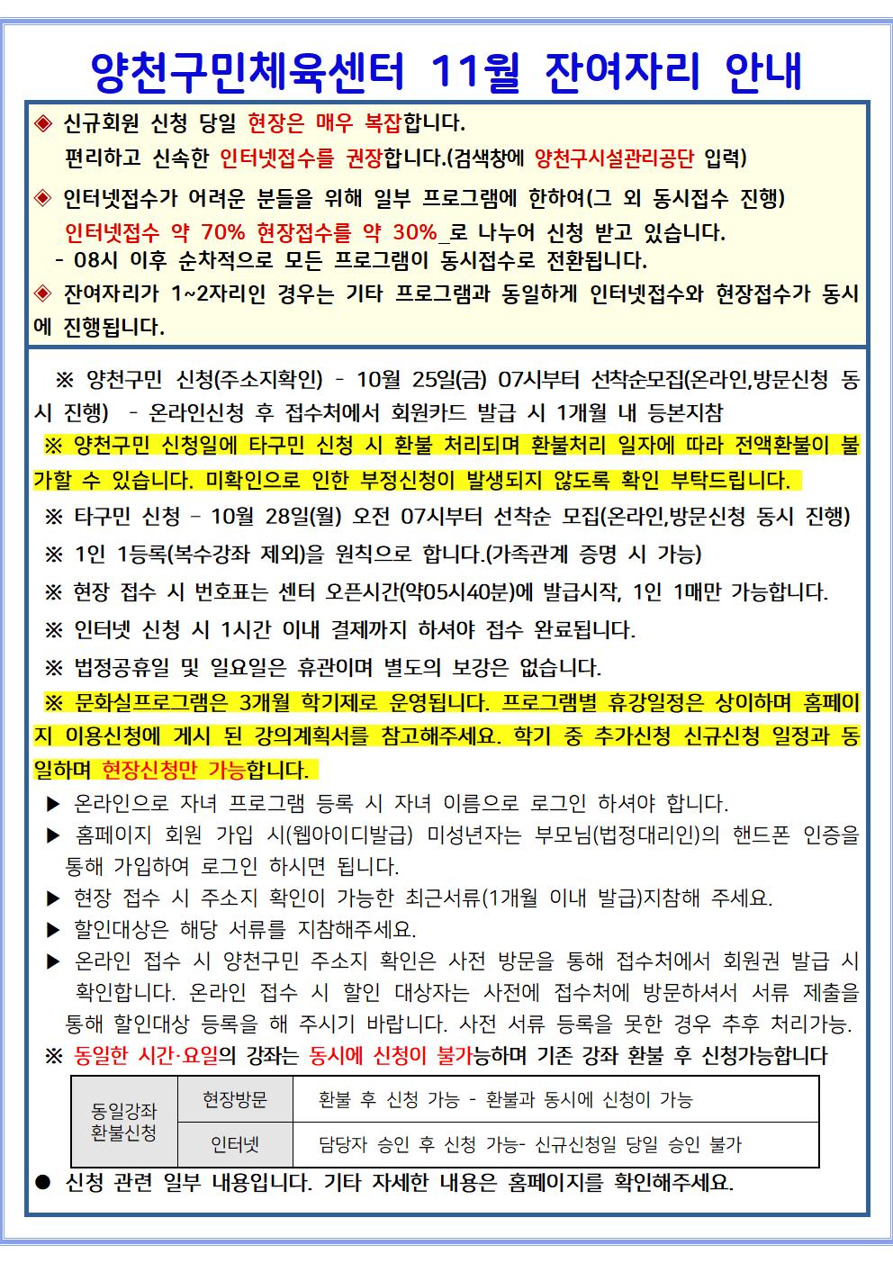 양천구민체육센터 양천구민체육센터 11월 프로그램 잔여자리 안내