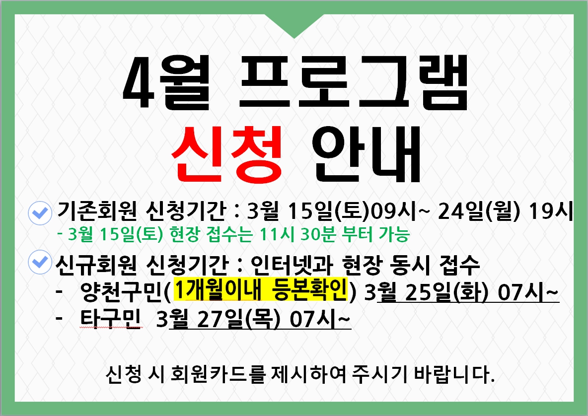 양천구민체육센터 4월 프로그램 신청 안내 작성자 임명희 등록일자 2025년 3월 17일 13시 32분 27초 조회 782 20250317_133035.jpg [ Size : 448.63KB , Down : 1,232 ] 미리보기 다운로드 목록보기