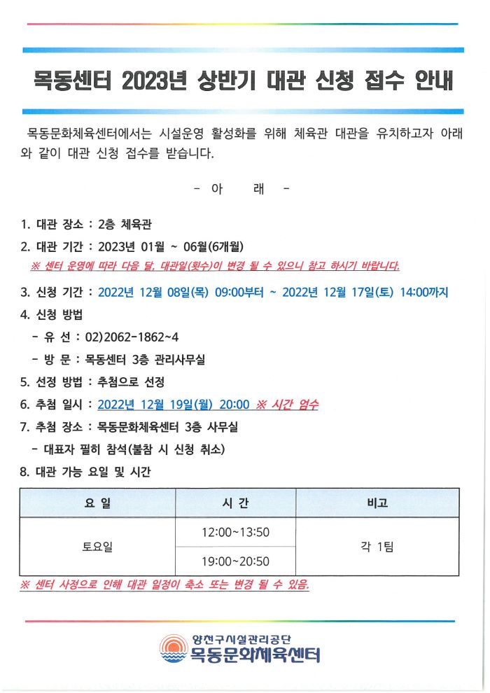 목동문화체육센터 목동문화체육센터 2023년도 상반기 체육관 대관신청 안내 작성자 관리자 등록일자 2022년 12월 8일 10시 7분 56초 조회 486 2023년 상반기 체육관 대관신청 안내지1.jpg [ Size : 89.72KB , Down : 328 ] 미리보기 다운로드 목록보기
