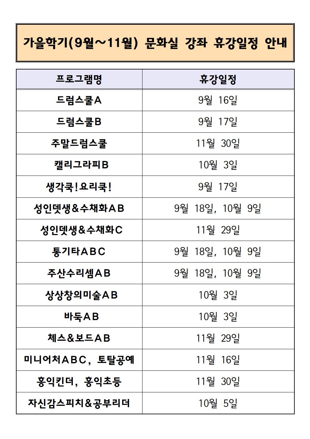 양천구민체육센터 양천구민체육센터 문화실 프로그램 가을학기 휴강일정(수정) 작성자 임명희 등록일자 2024년 10월 30일 8시 36분 56초 조회 255 가을학기 휴강일정001.jpg [ Size : 151.86KB , Down : 224 ] 미리보기 다운로드 목록보기