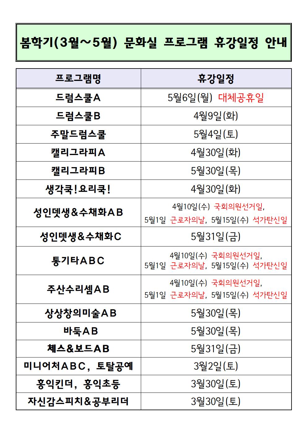 양천구민체육센터 양천구민체육센터 봄학기 문화실 프로그램 수업(휴강)일정 안내 작성자 임명희 등록일자 2024년 2월 23일 10시 23분 58초 조회 468 봄학기 휴강일정001.jpg [ Size : 185.53KB , Down : 303 ] 미리보기 다운로드 목록보기