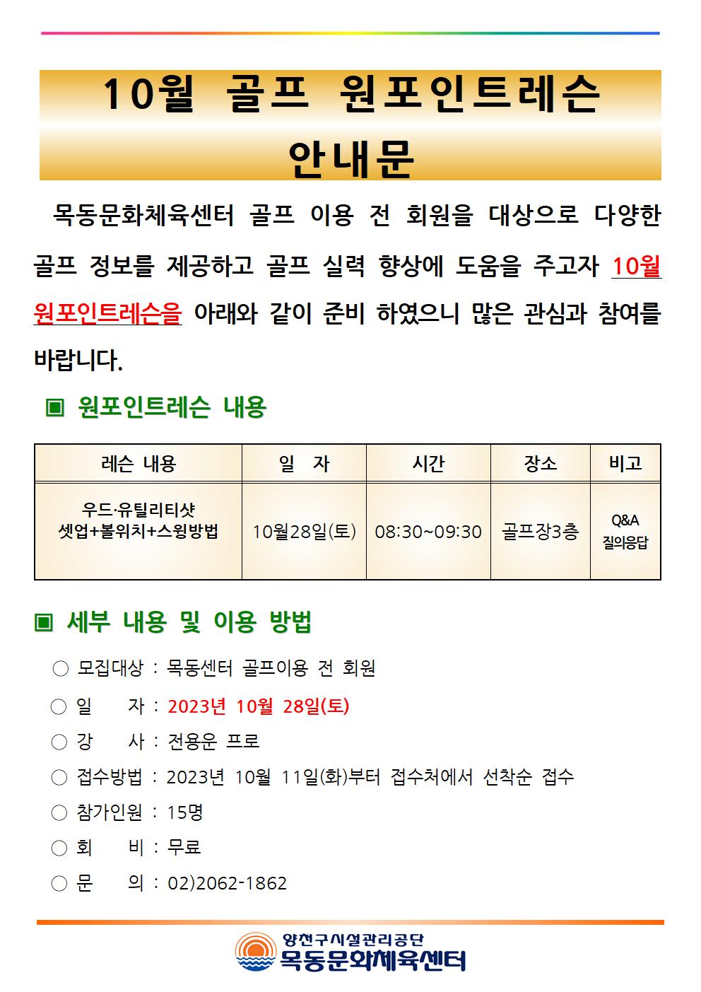 목동문화체육센터 목동문화체육센터 10월 골프 원포인트레슨 안내 작성자 임혜연 등록일자 2023년 10월 11일 17시 18분 41초 조회 397 목동센터 10월 골프 원포인트레슨 안내문001.jpg [ Size : 147.64KB , Down : 136 ] 미리보기 다운로드 목록보기