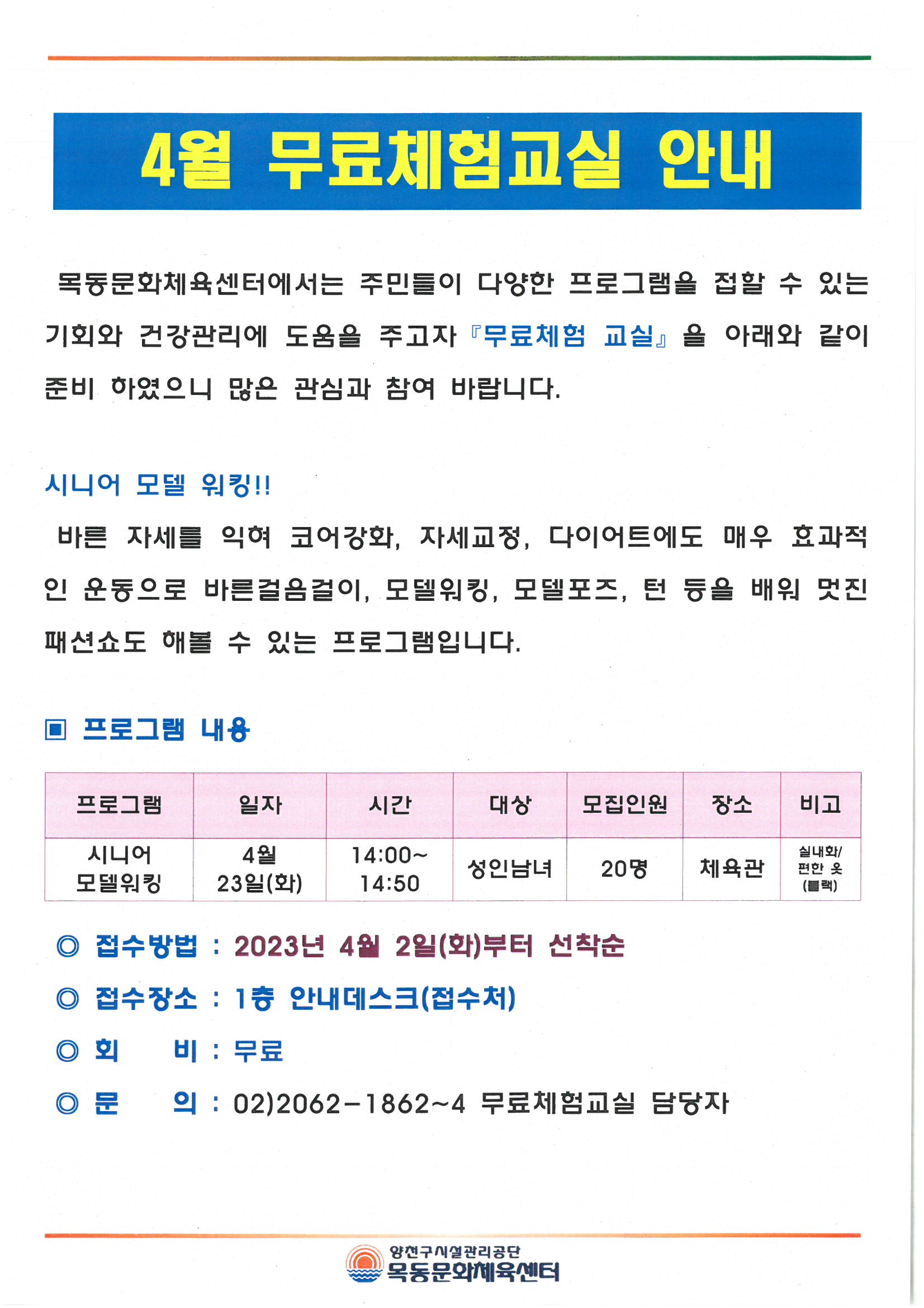 목동문화체육센터 목동문화체육센터 4월 무료체험교실 운영 안내 작성자 신영범 등록일자 2024년 4월 3일 15시 57분 32초 조회 451 4월 무료체험 교실 안내지(스캔).jpg [ Size : 325.15KB , Down : 283 ] 미리보기 다운로드 목록보기