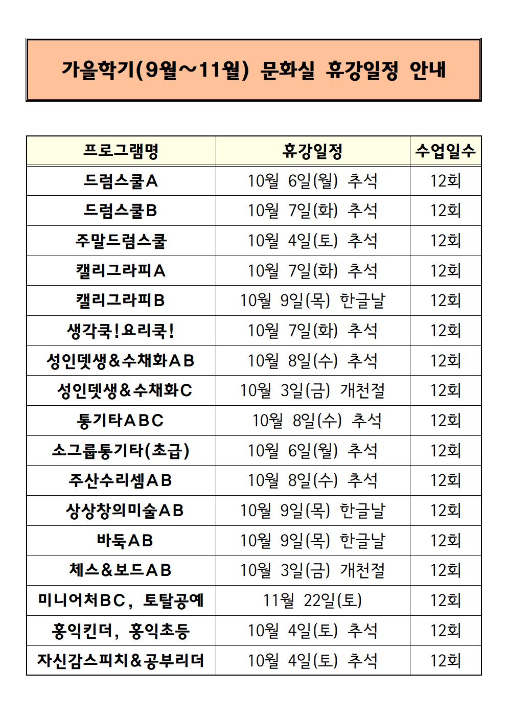 양천구민체육센터 양천구민체육센터 가을학기 문화실 프로그램 휴강일정(수정) 작성자 임명희 등록일자 2025년 9월 27일 11시 18분 32초 조회 100 가을학기 휴강일정001.jpg [ Size : 201.57KB , Down : 118 ] 미리보기 다운로드 목록보기