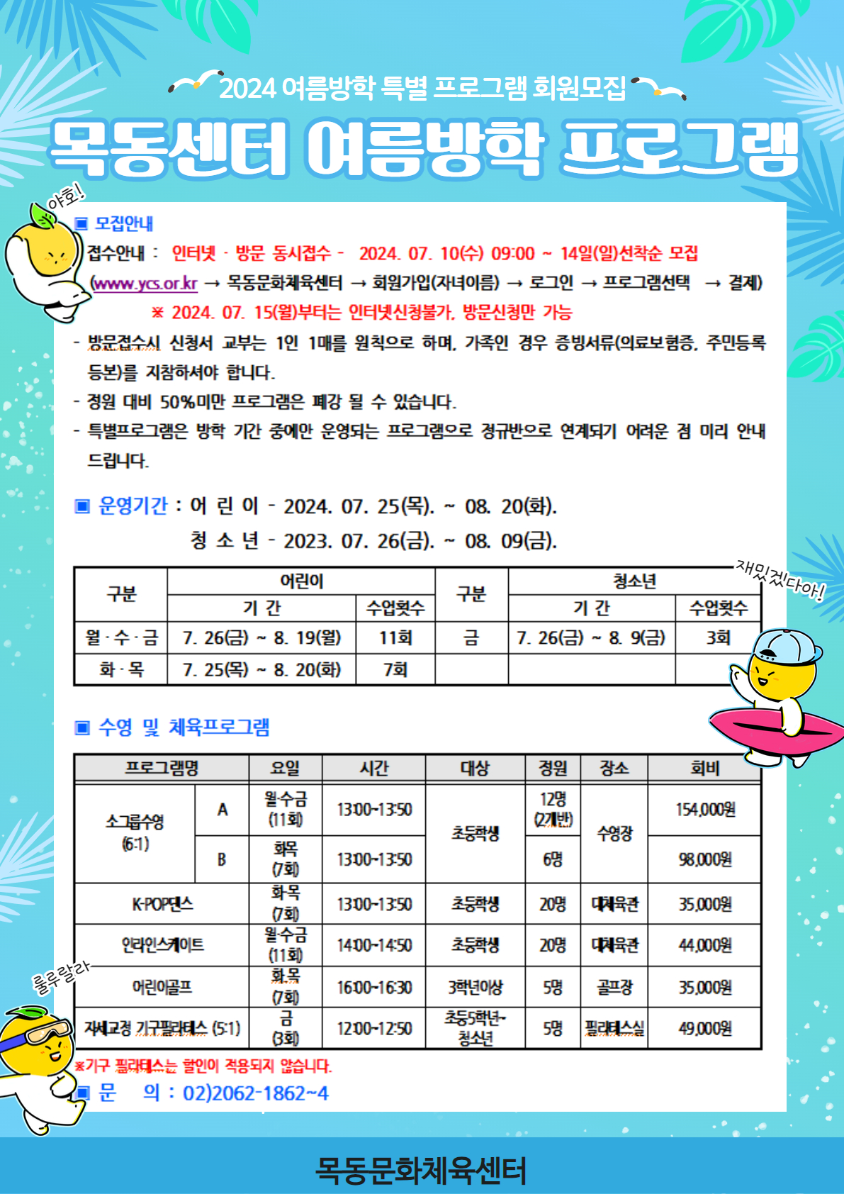 목동문화체육센터 목동문화체육센터 여름방학특별프로그램 안내 작성자 강주연 등록일자 2024년 6월 18일 13시 46분 12초 조회 590 여름방학특강 안내지(수정).jpg [ Size : 1.3MB , Down : 476 ] 미리보기 다운로드 목록보기