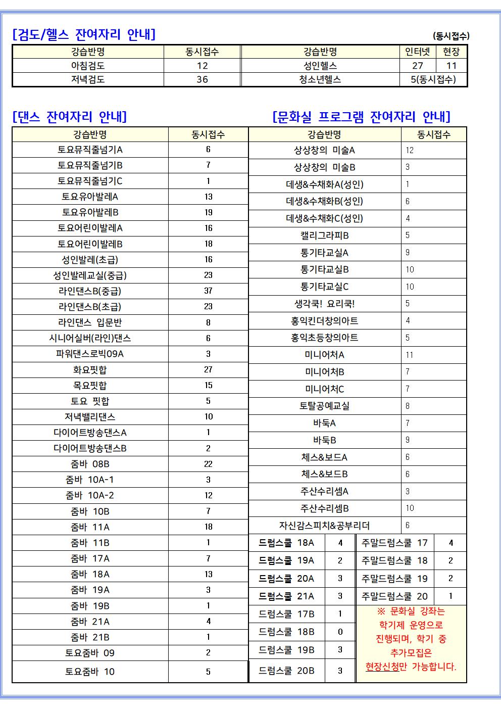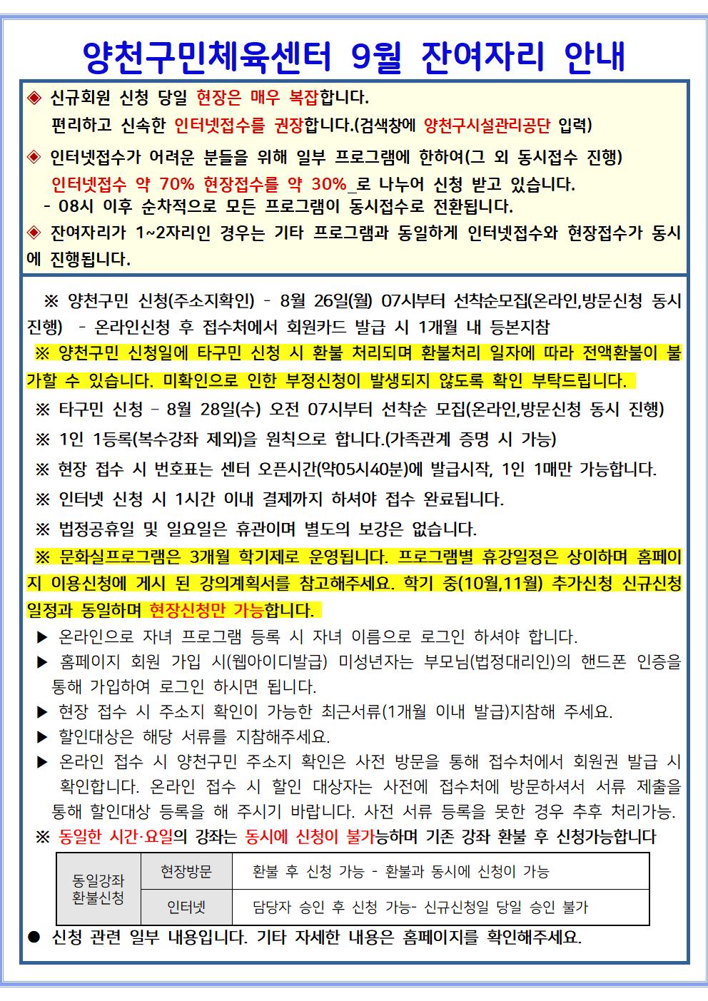 양천구민체육센터 양천구민체육센터 9월 프로그램 잔여자리 안내