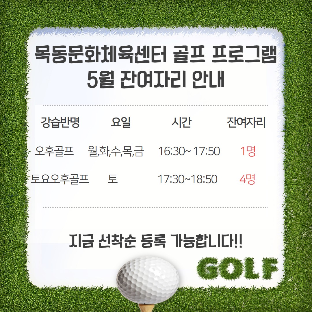 목동문화체육센터 목동문화체육센터 5월 골프 프로그램 잔여인원 안내 작성자 임혜연 등록일자 2025년 6월 2일 18시 57분 37초 조회 225 5월골프잔여.jpg [ Size : 373.85KB , Down : 71 ] 미리보기 다운로드 목록보기