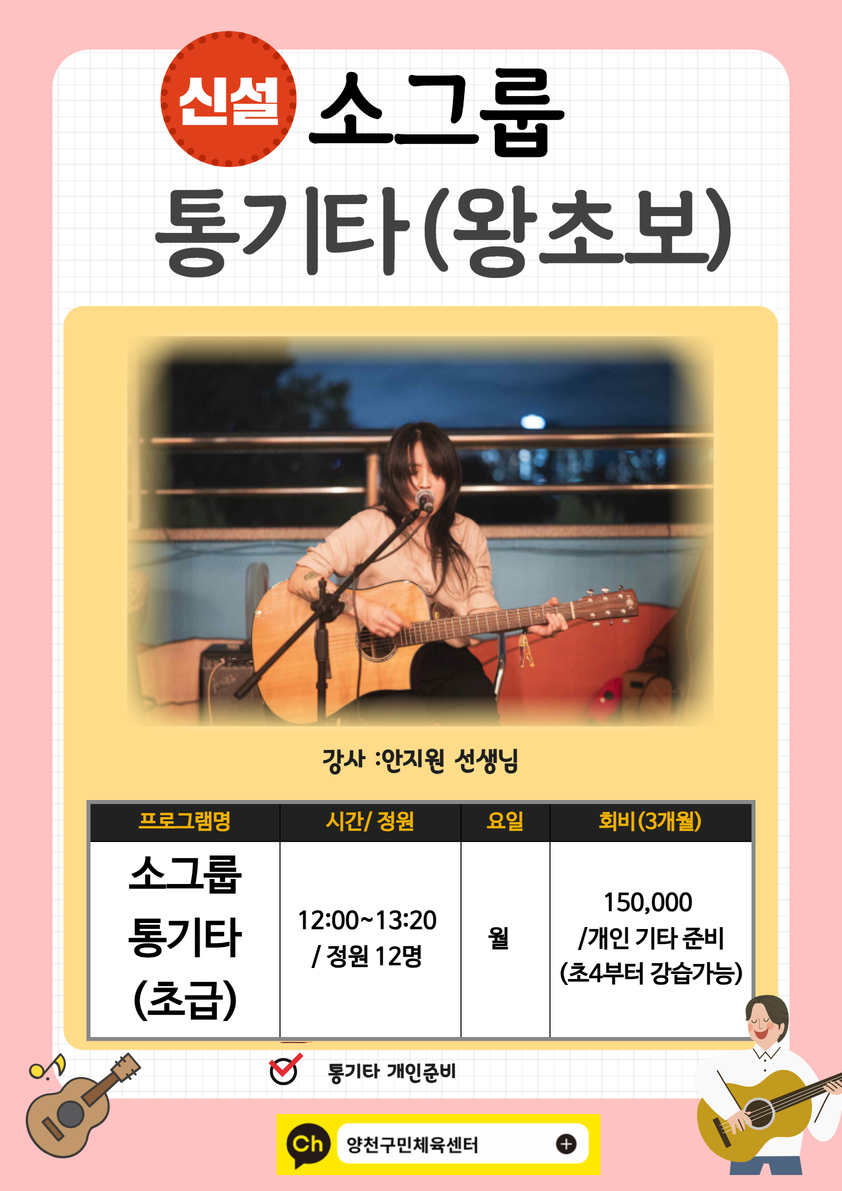 양천구민체육센터 양천구민체육센터 소그룹통기타(초급)교실 신설 운영 안내 작성자 임명희 등록일자 2025년 8월 13일 17시 15분 29초 조회 208 가을학기(9월~11월)부터 신설 운영!!8월 25일(월) 07시부터 양천구민 선착순 신청 8월 27일(수) 07시부터 타구민 신청 가능 (온라인, 오프라인 동시 접수) 소그룹통기타교실.jpg [ Size : 489.47KB , Down : 194 ] 미리보기 다운로드 목록보기