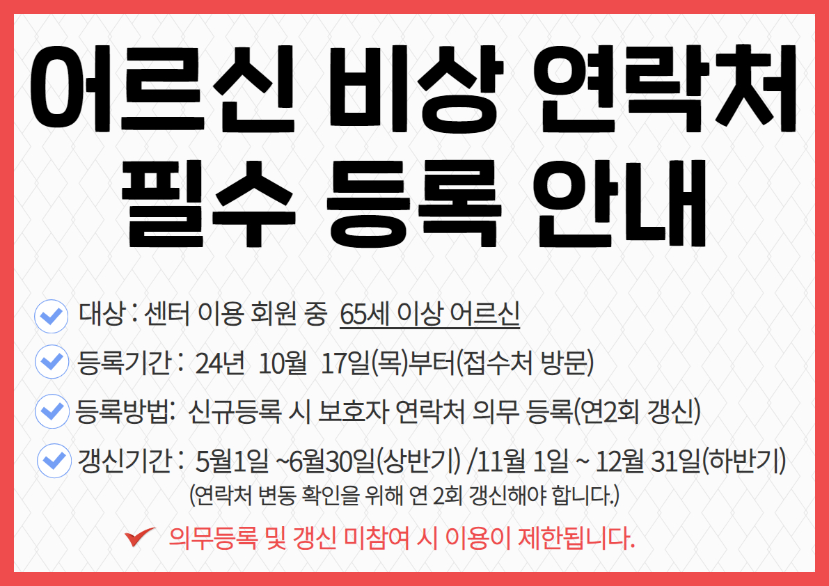 양천구민체육센터 어르신 비상연락처 등록제 안내 작성자 임명희 등록일자 2024년 10월 21일 10시 57분 52초 조회 178 어르신 연락처 등록.jpg [ Size : 596.31KB , Down : 137 ] 미리보기 다운로드 목록보기