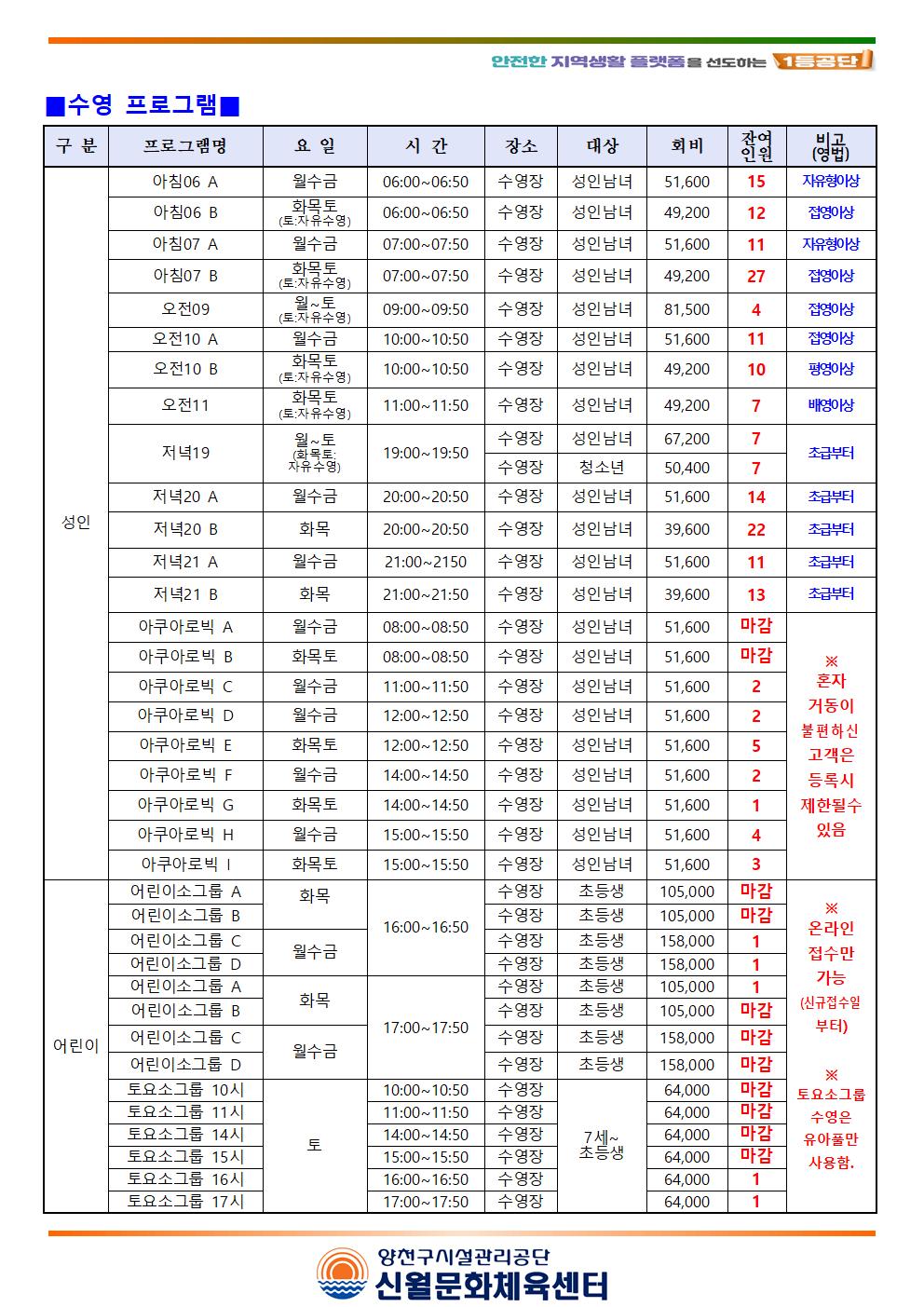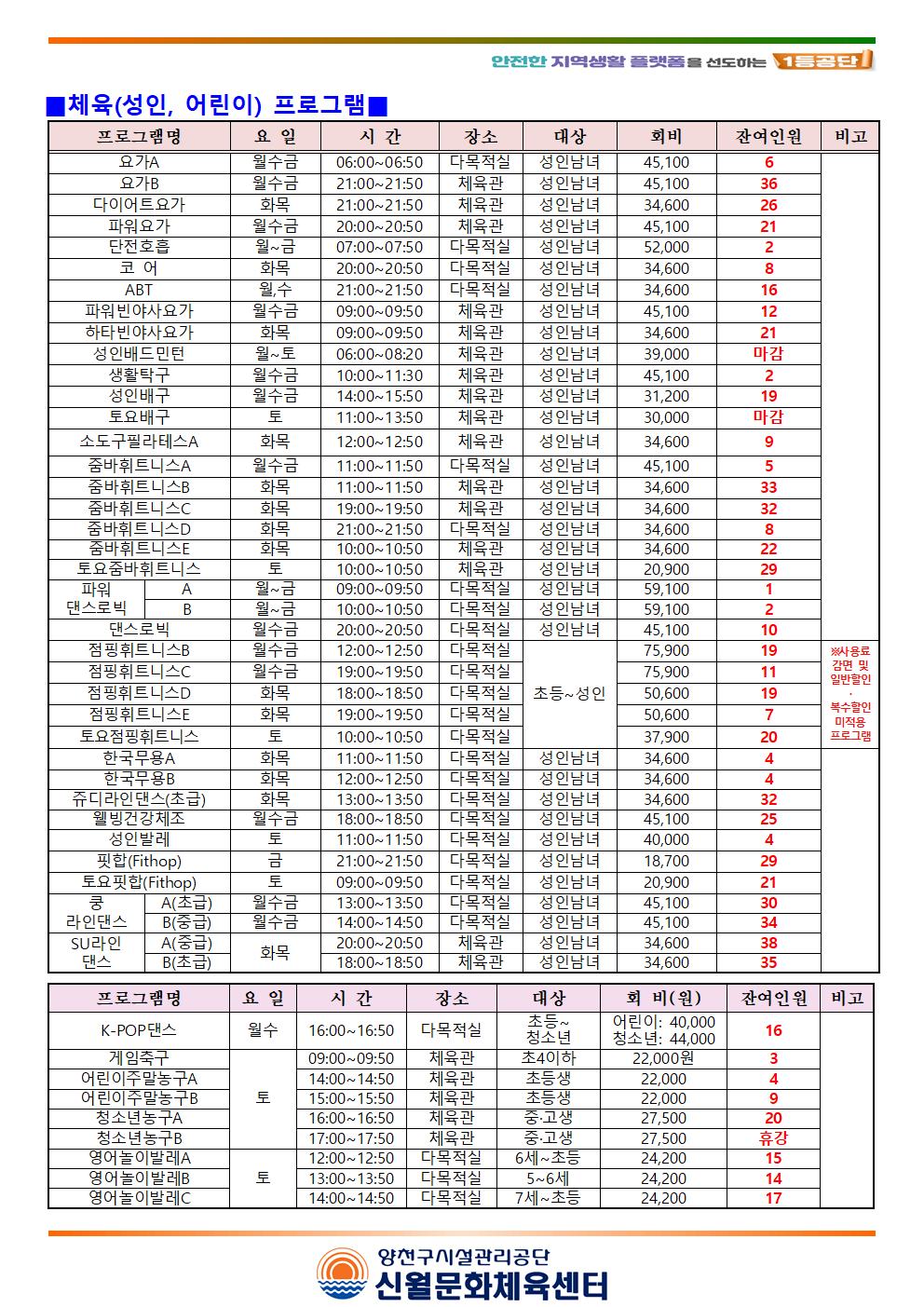 신월문화체육센터 신월문화체육센터 3월 마감프로그램 및 잔여인원 안내