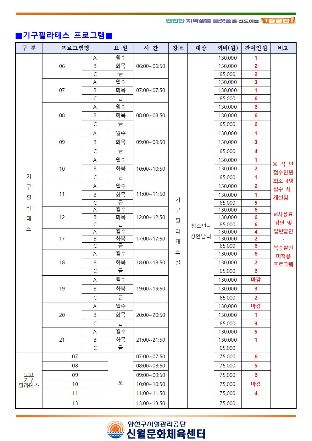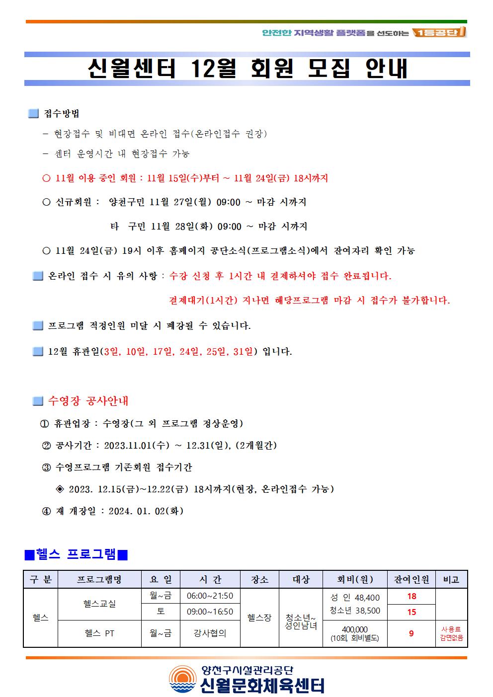 신월문화체육센터 신월문화체육센터 12월 마감프로그램 및 잔여인원 안내 작성자 손미선 등록일자 2023년 11월 24일 18시 13분 15초 조회 653 신월센터 12월 회원 모집안내(2023.12001.jpg [ Size : 151.5KB , Down : 599 ] 미리보기 다운로드 신월센터 12월 회원 모집안내(2023.12002.jpg [ Size : 336.53KB , Down : 600 ] 미리보기 다운로드 신월센터 12월 회원 모집안내(2023.12003.jpg [ Size : 189.71KB , Down : 580 ] 미리보기 다운로드 목록보기