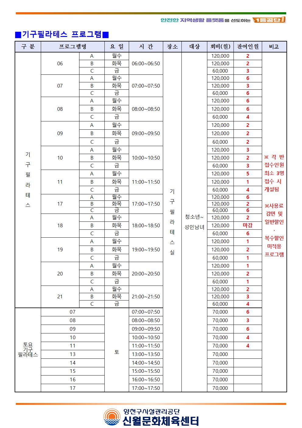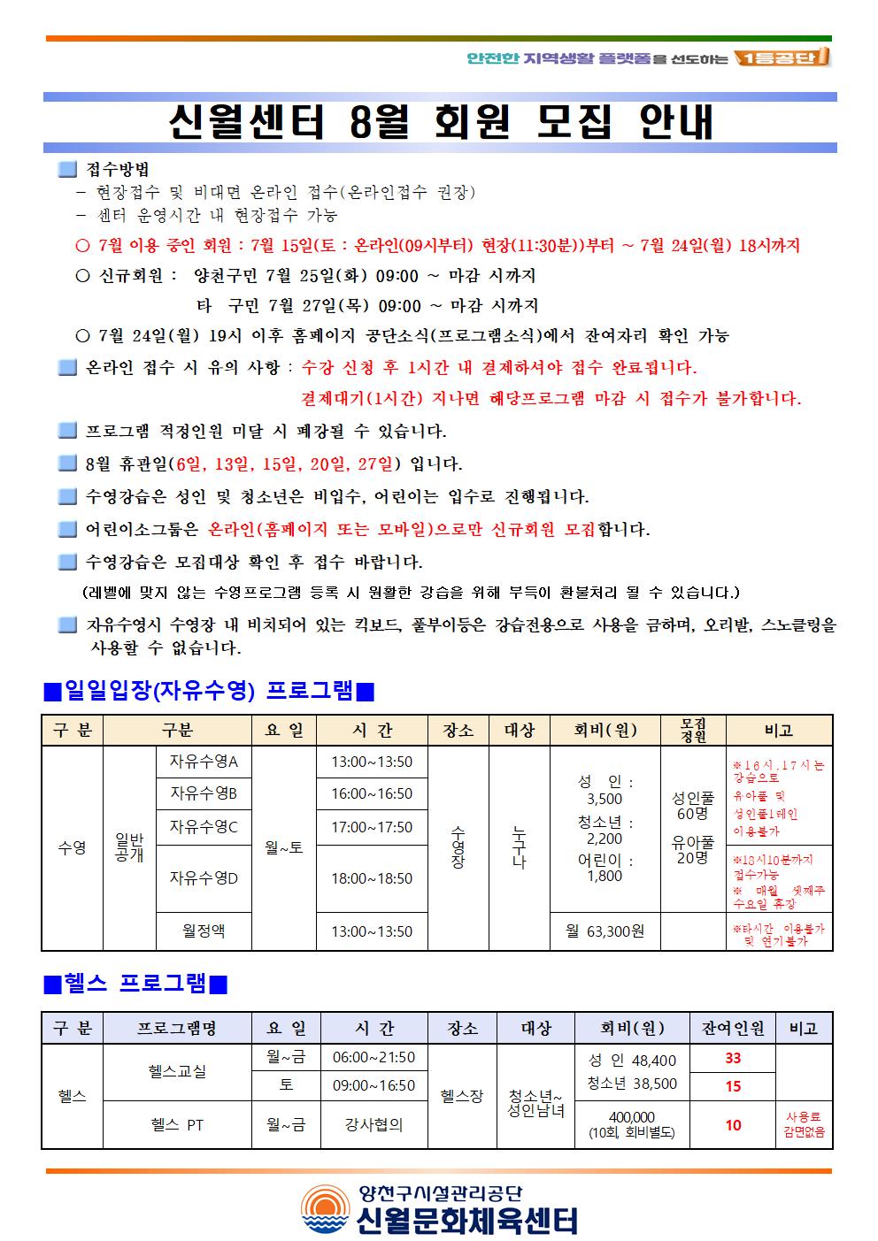 신월문화체육센터 신월문화체육센터 8월 마감프로그램 및 잔여인원 안내(헬스,수영, 체육, 기구필라테스) 작성자 손미선 등록일자 2023년 7월 24일 18시 36분 37초 조회 1,207 신월센터 8월 회원 모집안내(2023.8001.jpg [ Size : 215.08KB , Down : 1,329 ] 미리보기 다운로드 신월센터 8월 회원 모집안내(2023.8002.jpg [ Size : 295.28KB , Down : 1,323 ] 미리보기 다운로드 신월센터 8월 회원 모집안내(2023.8003.jpg [ Size : 335.23KB , Down : 1,265 ] 미리보기 다운로드 신월센터 8월 회원 모집안내(2023.8004.jpg [ Size : 190.82KB , Down : 1,251 ] 미리보기 다운로드 목록보기