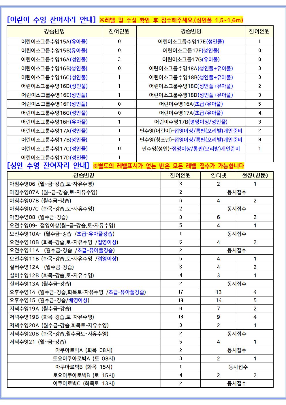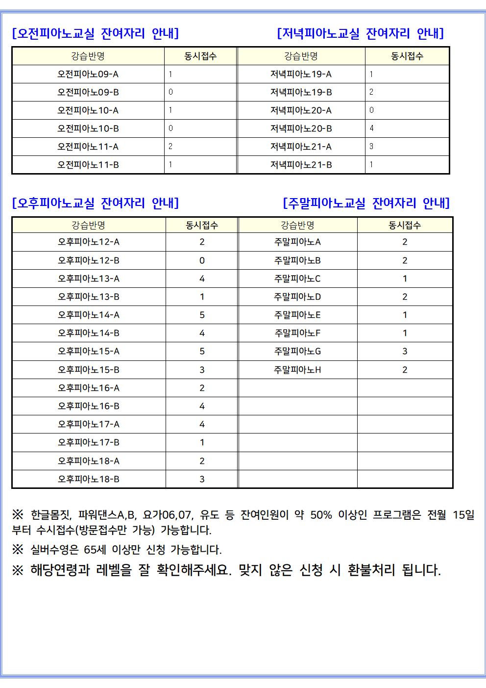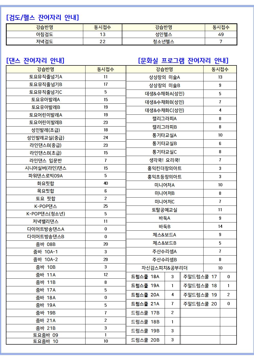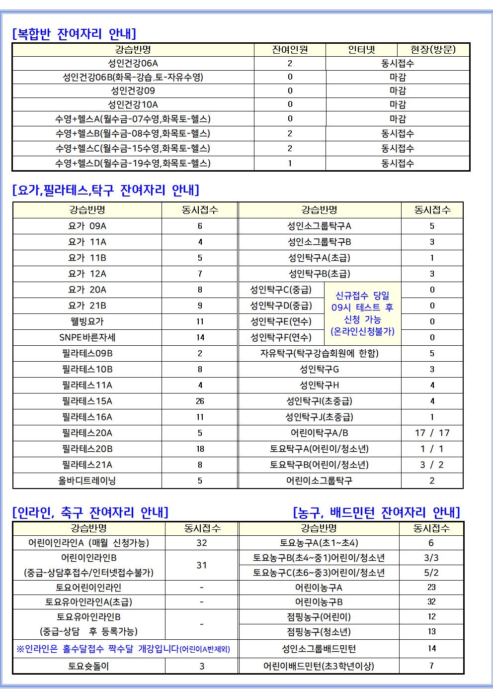 잔여자리 외 기타 안내사항은 이용안내 및 프로그램안내 등의 게시물에서 확인 가능합니다.