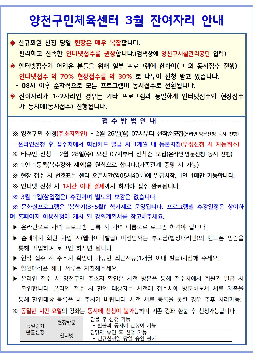 양천구민체육센터 양천구민체육센터 3월 운영프로그램 잔여자리 안내