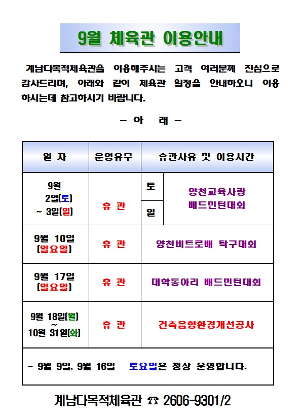 계남다목적체육관 계남다목적체육관 9월 이용안내 작성자 등록일자 2017년 8월 29일 17시 18분 18초 조회 1,568 계남다목적체육관 9월 안내사항을 붙임과 같이 게시 하오니 참고하여 주시기 바랍니다. 9월 대관.jpg [ Size : 126.72KB , Down : 111 ] 미리보기 다운로드 목록보기