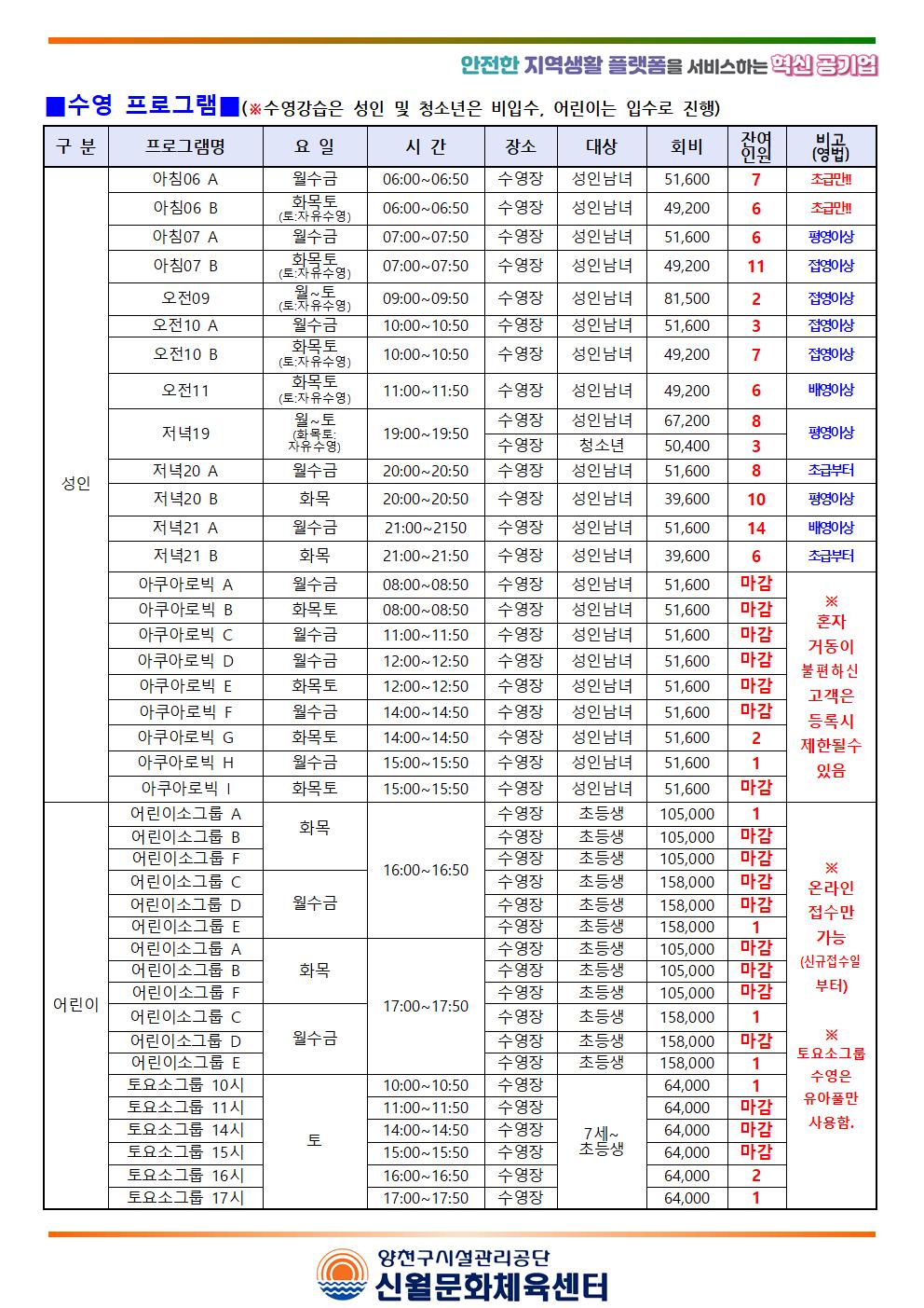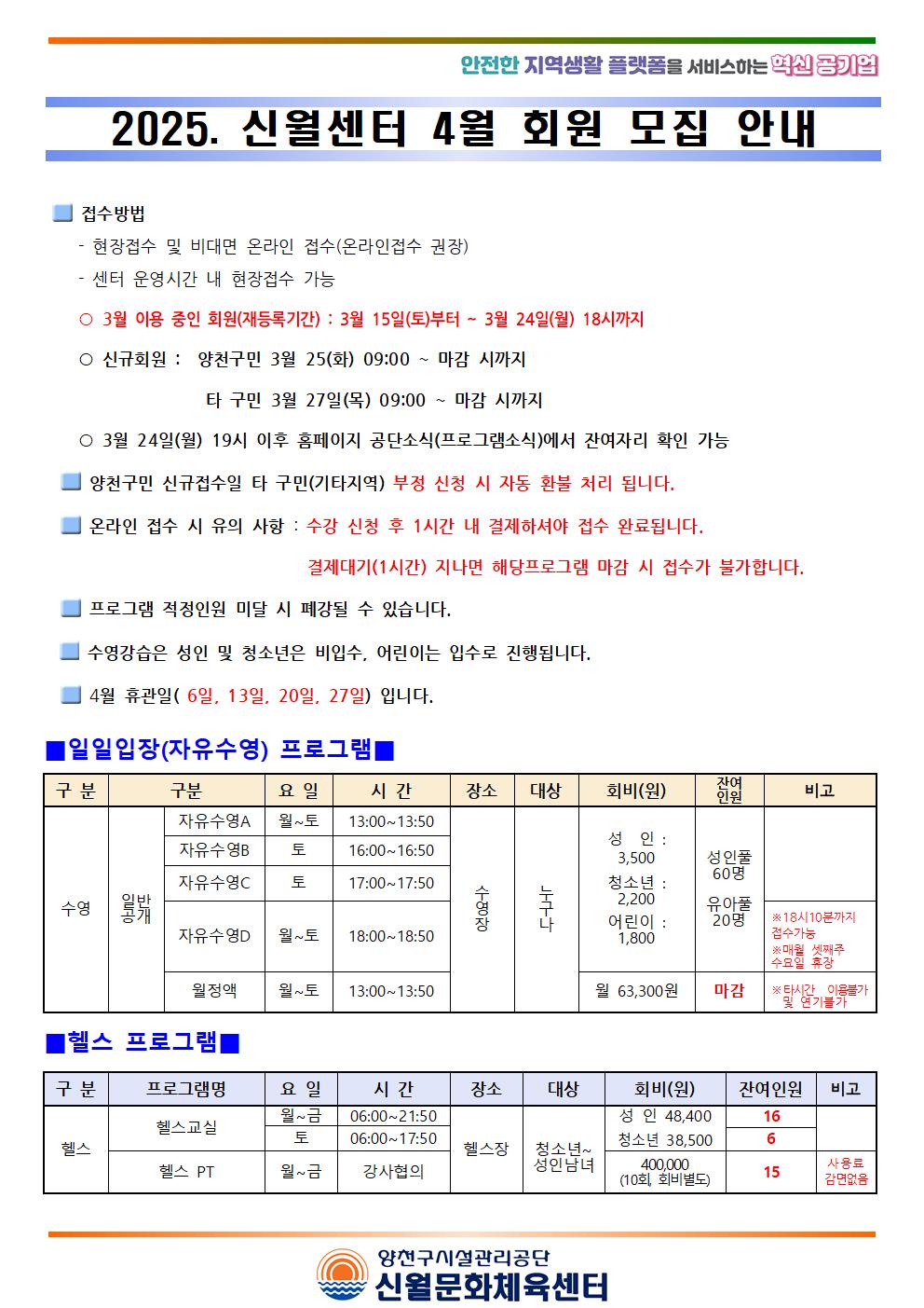 신월문화체육센터 신월문화체육센터 4월 프로그램 마감 및 잔여인원 안내 작성자 신영범 등록일자 2025년 3월 24일 18시 33분 50초 조회 781 신월센터 4월 회원 모집안내(2025.4001.jpg [ Size : 189.77KB , Down : 967 ] 미리보기 다운로드 신월센터 4월 회원 모집안내(2025.4002.jpg [ Size : 305.55KB , Down : 960 ] 미리보기 다운로드 신월센터 4월 회원 모집안내(2025.4003.jpg [ Size : 340.81KB , Down : 930 ] 미리보기 다운로드 신월센터 4월 회원 모집안내(2025.4004.jpg [ Size : 197KB , Down : 930 ] 미리보기 다운로드 목록보기